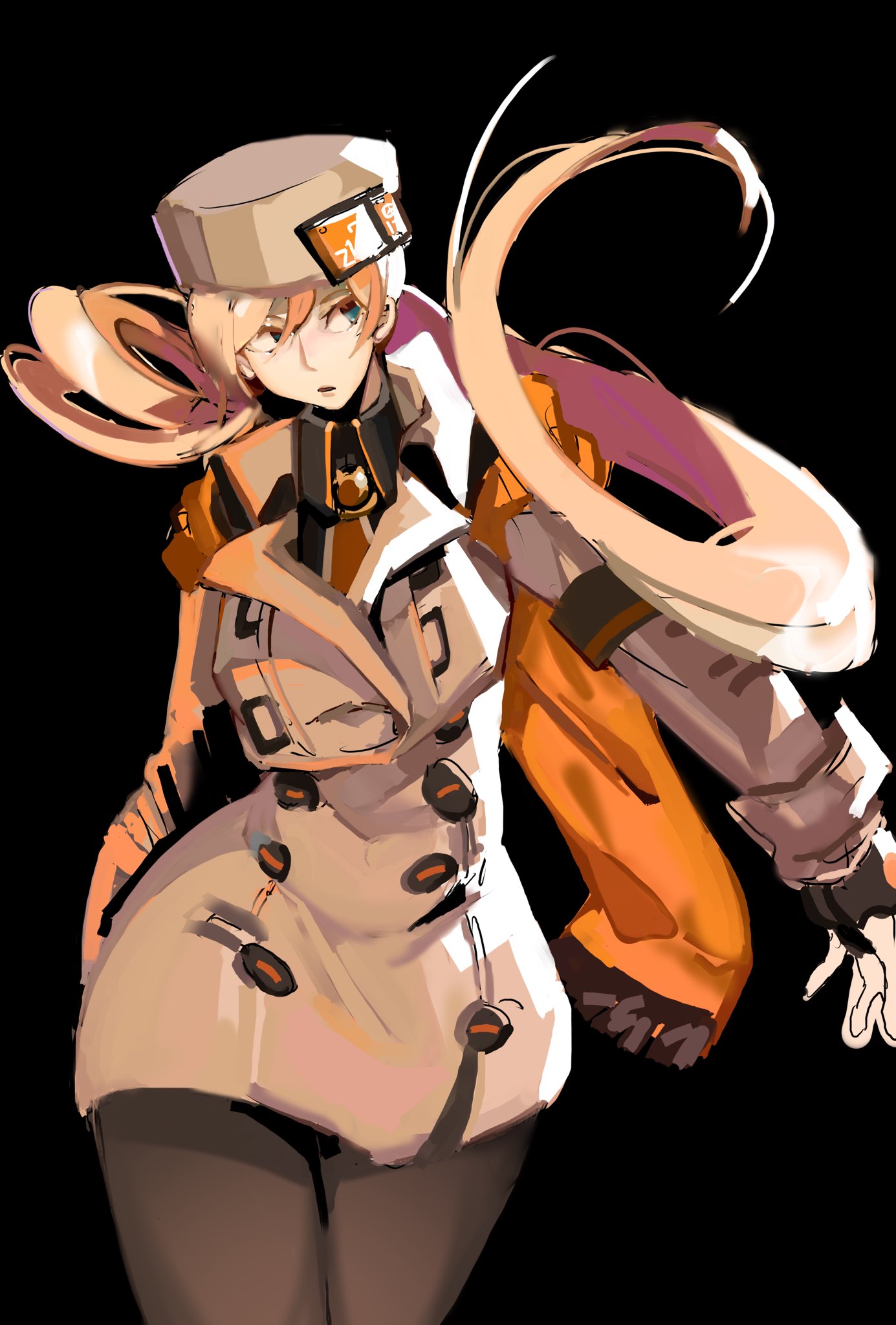 1girl absurdly_long_hair blonde_hair blue_eyes brown_coat buttons coat fur_hat guilty_gear guilty_gear_strive hat highres long_hair long_sleeves millia_rage pantyhose s0gaharahen ushanka very_long_hair yellow_hat