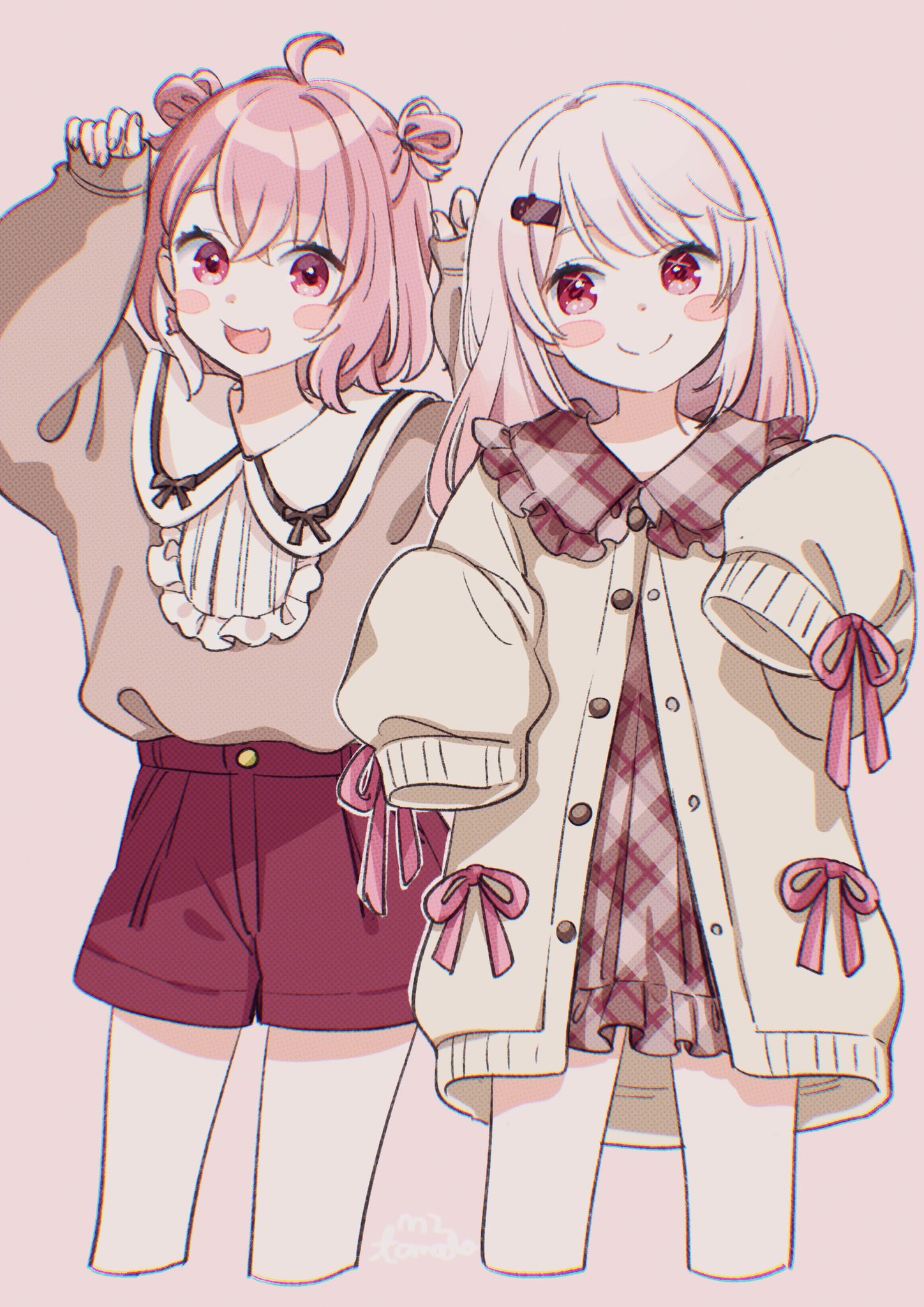 2girls ahoge arms_up baggy_clothes blush_stickers brown_dress brown_shirt cardigan collar cropped_legs crossed_bangs dress fang frilled_collar frilled_dress frilled_shirt_collar frills gradient_hair hair_behind_ear hair_ornament hairclip hand_up highres long_hair long_sleeves looking_at_viewer mizutamako multicolored_hair multiple_girls nijisanji open_mouth partially_unbuttoned paw_pose pink_hair plaid_clothes plaid_dress puffy_long_sleeves puffy_sleeves red_eyes red_ribbon red_shorts ribbon sasaki_saku shiina_yuika shirt shirt_tucked_in short_dress short_hair shorts single_hair_intake skin_fang sleeves_past_wrists smile swept_bangs two-tone_hair two_side_up virtual_youtuber white_collar white_hair yellow_cardigan