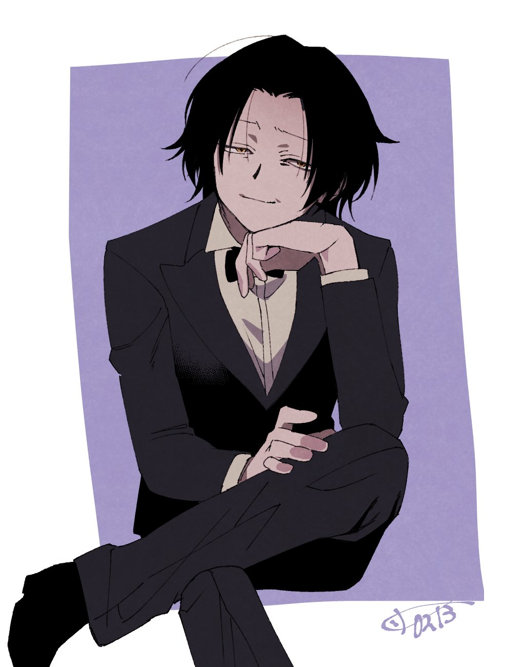 1boy black_bow black_bowtie black_hair black_jacket black_pants bow bowtie closed_mouth collared_shirt crossed_legs dated feitan_portor formal_clothes highres hunter_x_hunter invisible_chair jacket looking_at_viewer male_focus pants shirt shishanmo signature simple_background sitting solo suit two-tone_background white_shirt