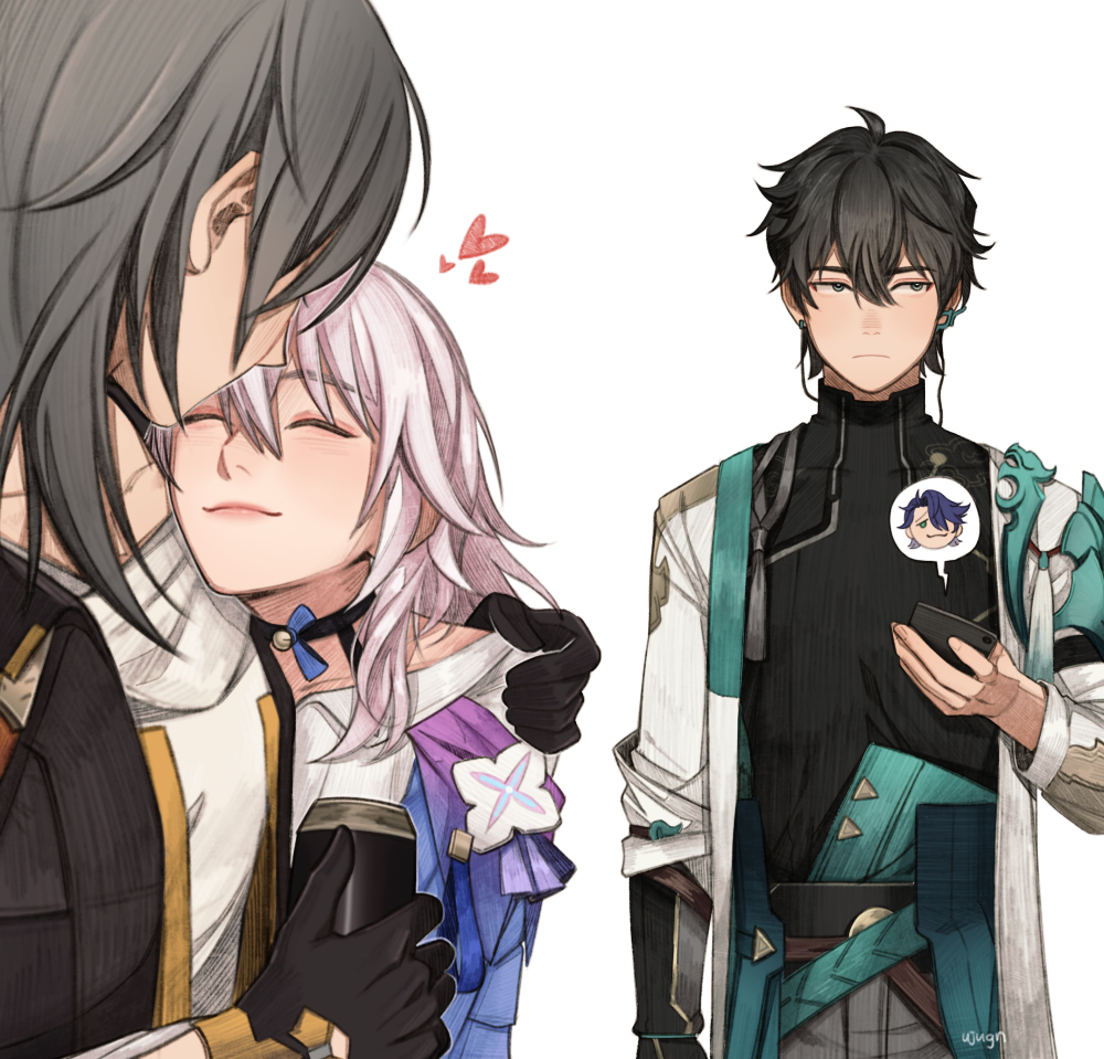 2girls black_hair blue_hair choker closed_eyes commentary covered_collarbone dan_heng_(honkai:_star_rail) dan_heng_(hunt)_(honkai:_star_rail) english_commentary gloves grey_hair hair_between_eyes heart holding holding_phone honkai:_star_rail honkai_(series) hug long_sleeves march_7th_(honkai:_star_rail) march_7th_(preservation)_(honkai:_star_rail) multiple_girls phone sampo_koski simple_background smile stelle_(honkai:_star_rail) trailblazer_(honkai:_star_rail) ujugn white_background yuri