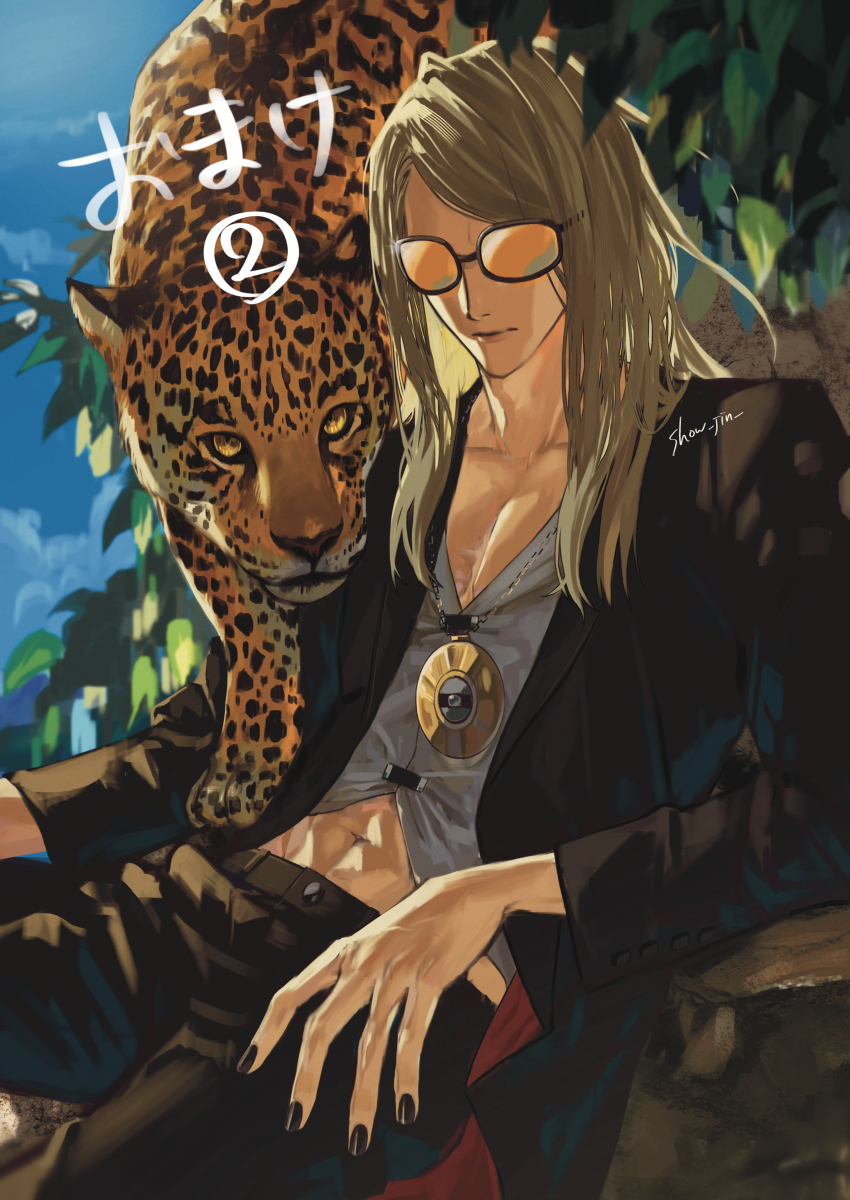 1boy animal black_jacket black_nails black_pants blonde_hair fate/grand_order fate_(series) highres jacket jaguar jewelry kino_houki long_hair long_sleeves looking_at_viewer male_focus medallion midriff midriff_peek necklace non-web_source open_clothes open_jacket orange-tinted_eyewear outdoors pants shirt signature solo sunglasses tezcatlipoca_(fate) tezcatlipoca_(first_ascension)_(fate) tinted_eyewear white_shirt
