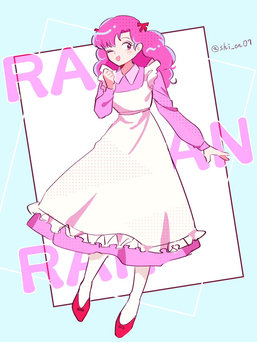 1girl character_name clenched_hand dress frilled_dress frills full_body highres layered_dress looking_to_the_side nanashi_(mia) open_hand pantyhose pink_dress pink_eyes pink_hair ran_(urusei_yatsura) red_footwear smile solo twitter_username urusei_yatsura white_dress white_pantyhose