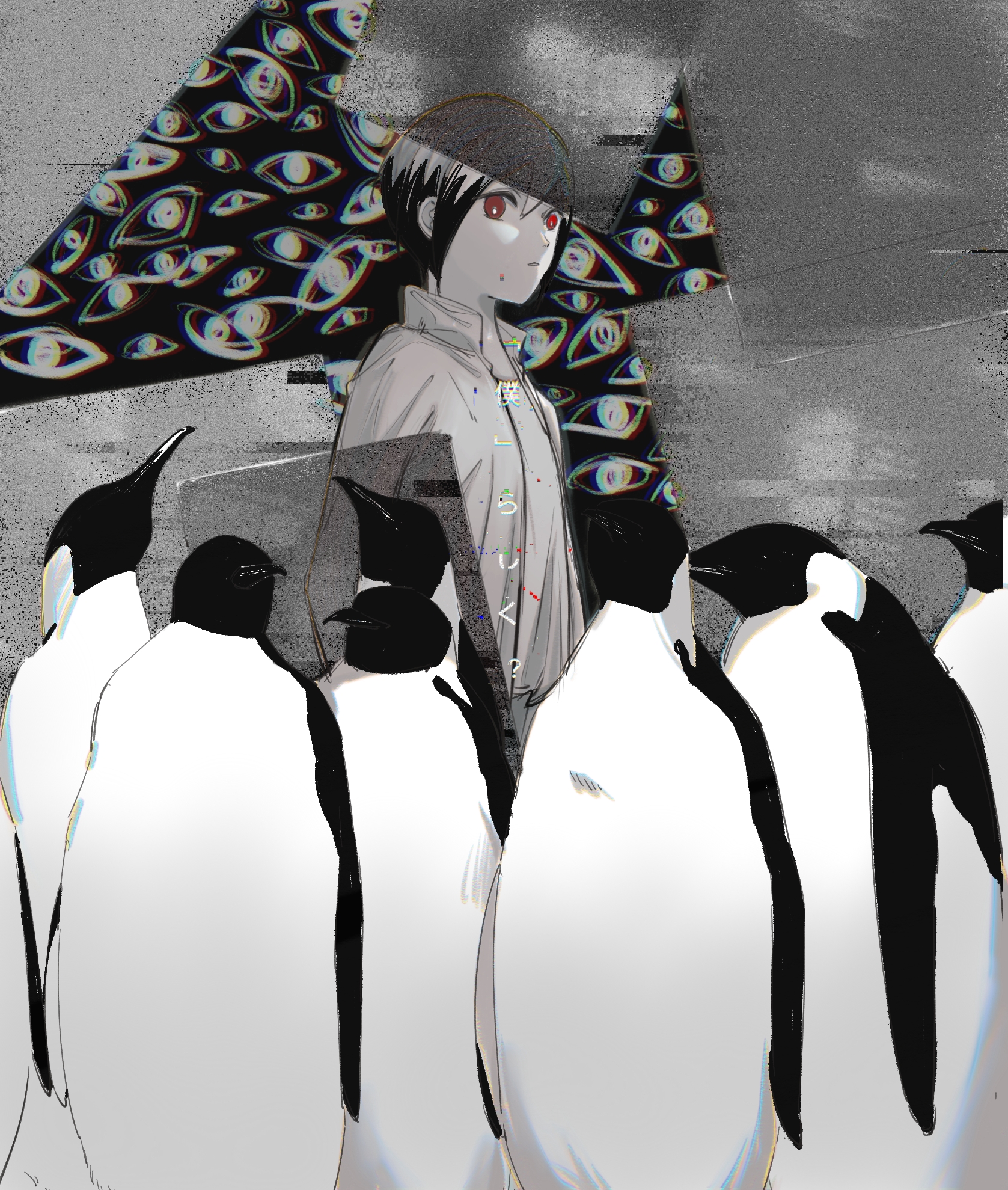 1boy bird black_hair highres idolmaster idolmaster_side-m jacket kitamura_sora looking_at_viewer male_focus multicolored_hair open_clothes open_jacket paper parted_lips penguin red_eyes spot_color tsukimi_miuo upper_body white_hair