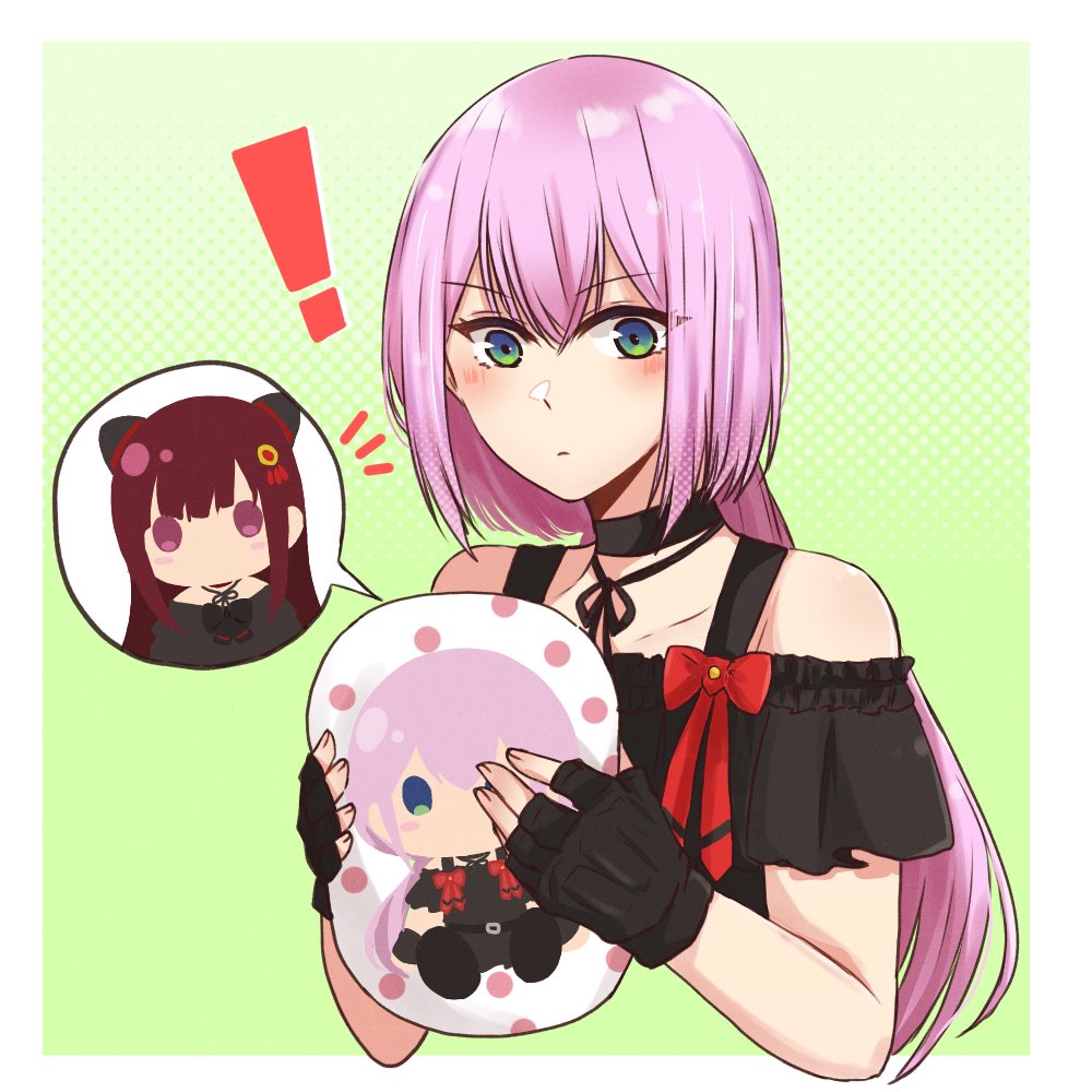 ! 1girl assault_lily bare_shoulders black_choker black_gloves black_ribbon black_shirt blue_eyes blush border bow character_print choker closed_mouth commentary cropped_torso fingerless_gloves frilled_shirt frilled_sleeves frills gloves gozen_(assault_lily) gradient_background gradient_eyes green_background green_eyes hair_between_eyes halftone halftone_background hands_up holding holding_pillow long_hair looking_at_object looking_down low_twintails multicolored_eyes neck_ribbon nigari_(ngari_0115) notice_lines outside_border pillow pink_hair print_pillow red_bow ribbon shirt solo speech_bubble spoken_character toda_eulalia_kotohi twintails upper_body white_border