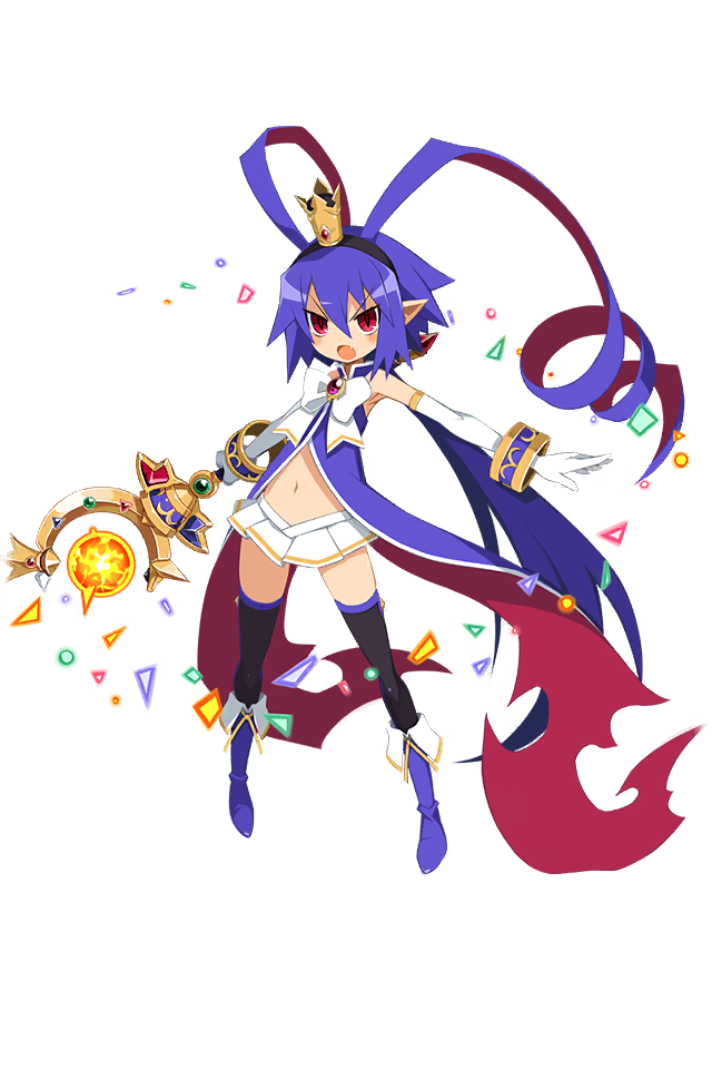 1girl antenna_hair blue_hair blush boots bow bracelet crown disgaea disgaea_rpg elbow_gloves full_body genderswap genderswap_(mtf) gloves holding holding_wand jewelry laharl magic magical_girl magical_girl_laharl miniskirt multicolored_hair navel non-web_source official_art open_mouth photoshop_(medium) pleated_skirt pointy_ears red_eyes red_hair skirt slit_pupils solo thighhighs transparent_background wand