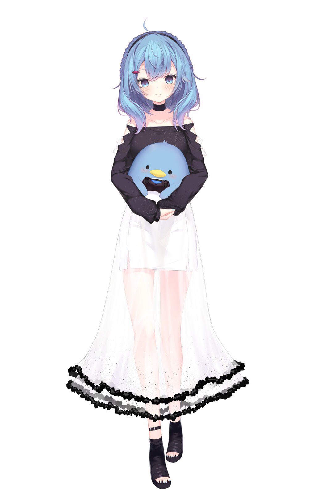 1girl ahoge black_shirt blue_eyes blue_hair braid highres indie_virtual_youtuber shirt skirt smile solo stuffed_animal stuffed_penguin stuffed_toy virtual_youtuber white_background white_skirt yururi_megu yuui_hutabakirage