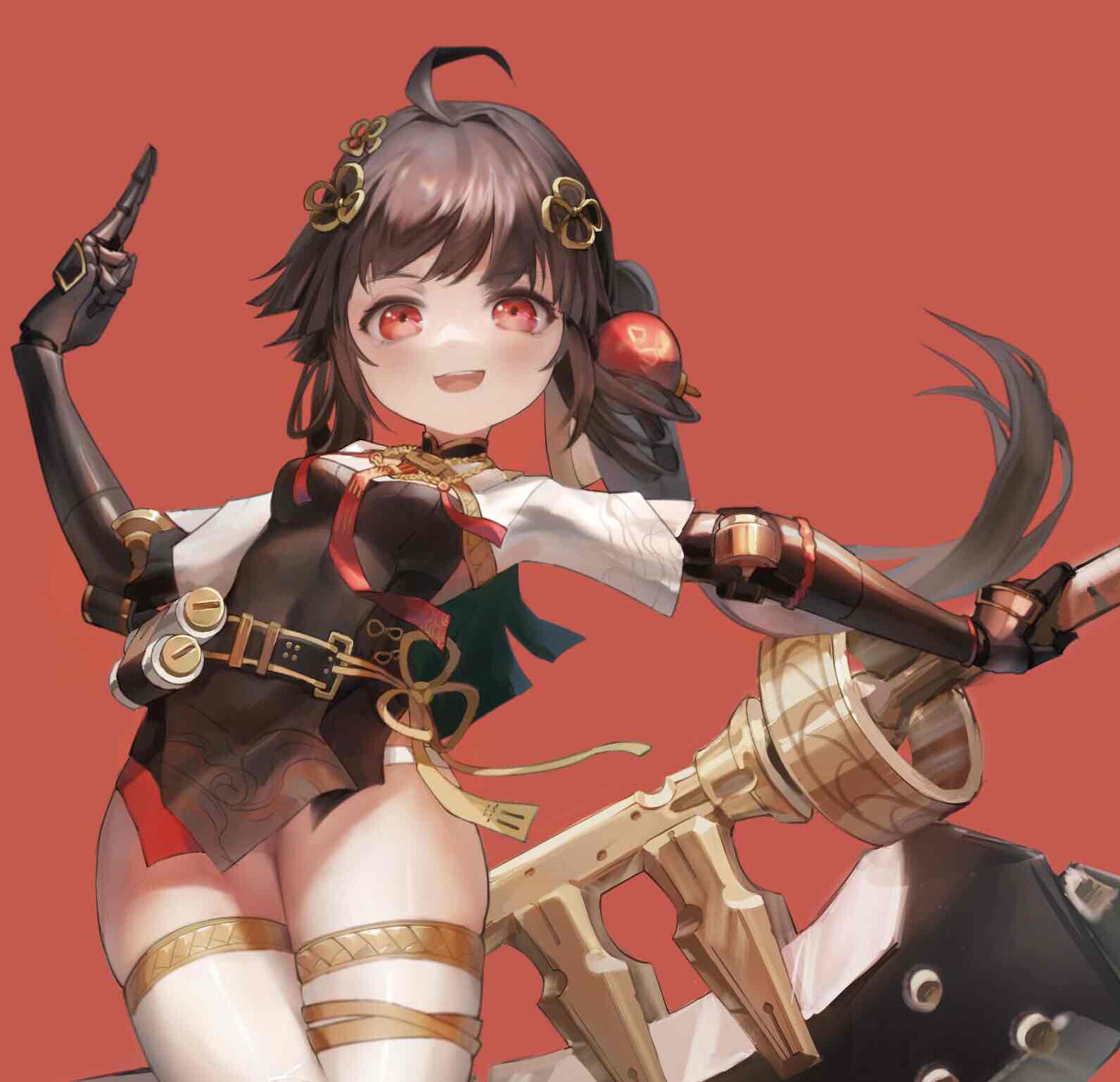1girl ahoge black_hair breasts chinese_clothes hair_ornament highres holding holding_weapon huge_weapon long_hair mechanical_arms open_mouth pulao:_dragontoll_(pgr) pulao_(pgr) punishing:_gray_raven red_background red_eyes short_sleeves side_ponytail small_breasts teeth thighhighs thighs upper_teeth_only weapon white_thighhighs xiaoxiaoanye