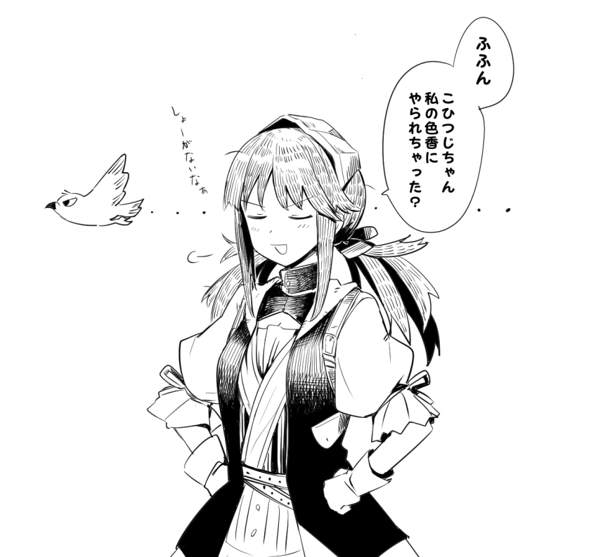 1girl bird closed_eyes commentary_request falcon_(girls'_frontline) girls'_frontline gloves greyscale hands_on_own_hips headscarf long_hair monochrome open_mouth puffy_short_sleeves puffy_sleeves sgnfleen short_sleeves sidelocks simple_background smug solo speech_bubble translation_request upper_body