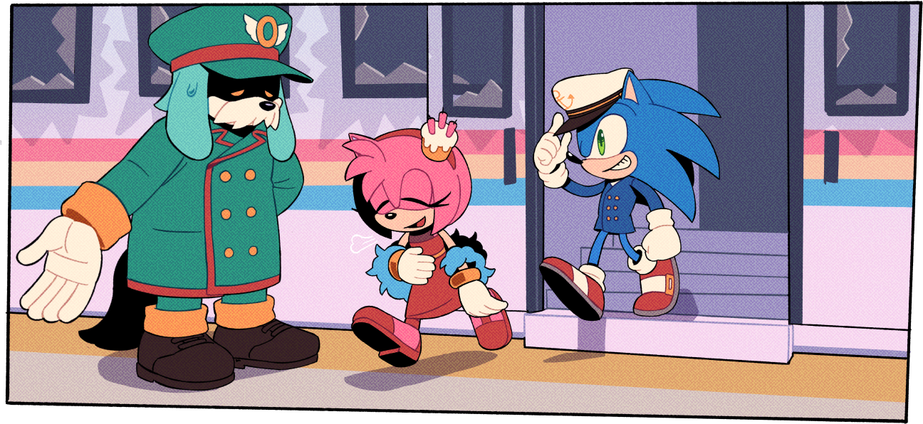 1girl 2boys adjusting_clothes adjusting_headwear amy_rose amy_rose_(journalist) anchor_symbol animal_ears animal_nose aqua_coat aqua_headwear aqua_pants arm_at_side arm_behind_back arm_up blue_fur blue_jacket body_fur border bottomless broken broken_window brown_footwear buttons cake candle clenched_hand closed_eyes coat conductor_(the_murder_of_sonic_the_hedgehog) digimin dog_boy dog_ears dog_tail double-breasted dress ear_covers eyes_in_shadow feather_boa flat_chest food full_body furry furry_female furry_male gloves green_eyes grin hairband half-closed_eyes hand_on_own_stomach hand_up happy hat jacket long_sleeves looking_at_another looking_to_the_side multiple_boys official_art open_mouth orange_eyes pants peaked_cap pink_fur puff_of_air red_dress red_footwear red_hairband ring_(sonic) shoes sideways_mouth single_ear_cover sleeveless sleeveless_dress smile socks sonic_(series) sonic_the_hedgehog sonic_the_hedgehog_(sea_captain) stairs standing sweat tail teeth the_murder_of_sonic_the_hedgehog train transparent_border two-tone_fur walking white_fur white_gloves white_socks window