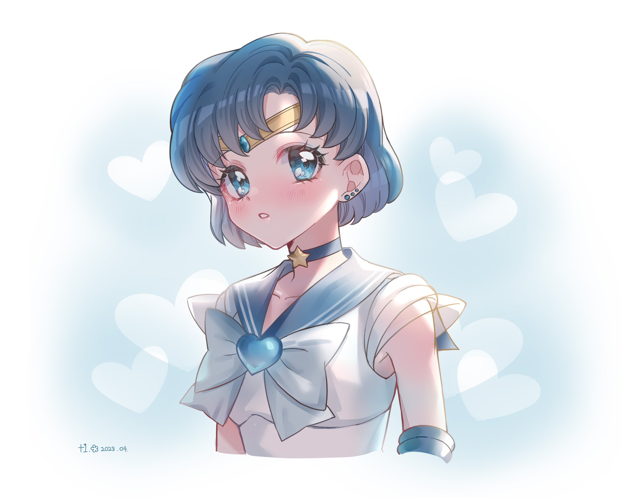 +1_(yakusoku0722) 1girl back_bow bishoujo_senshi_sailor_moon blue_bow blue_bowtie blue_choker blue_eyes blue_gem blue_hair blue_sailor_collar bow bowtie brooch choker circlet earrings elbow_gloves gem gloves highres jewelry leotard mizuno_ami sailor_collar sailor_mercury shirt short_hair short_sleeves solo star_(symbol) star_choker stud_earrings super_sailor_mercury swept_bangs white_leotard white_shirt