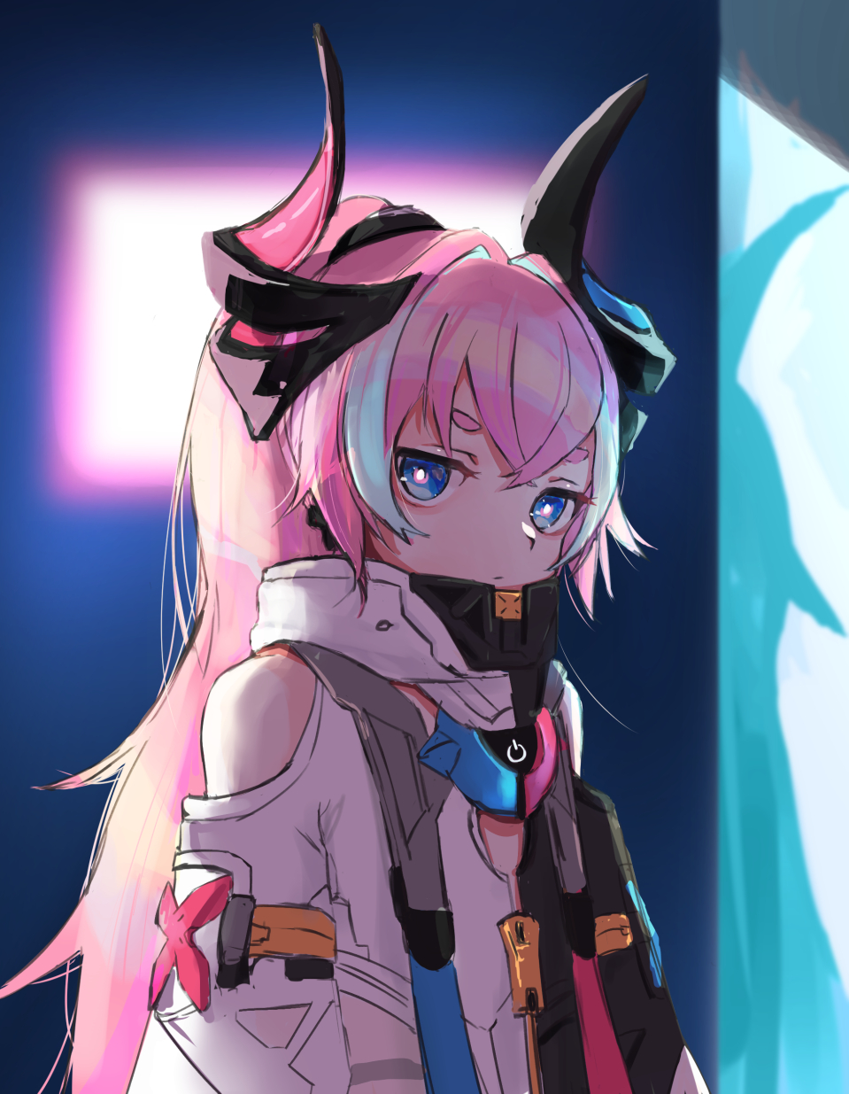 1girl arin_(1010_ssu) bare_shoulders blue_eyes closed_mouth highres honkai_(series) honkai_impact_3rd horns jacket long_hair long_sleeves looking_at_viewer pink_hair ponytail rozaliya_olenyeva delta_(honkai_impact) solo thick_eyebrows upper_body very_long_hair white_jacket