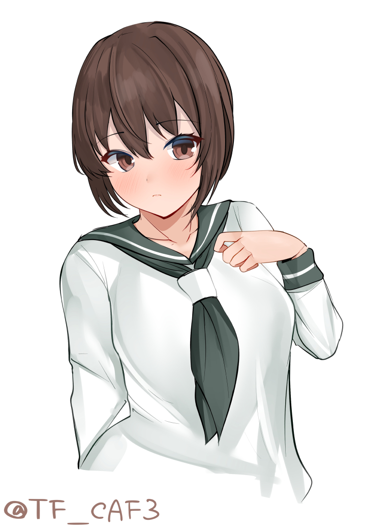 1girl alternate_costume brown_eyes brown_hair hyuuga_(kancolle) kantai_collection looking_at_viewer one-hour_drawing_challenge school_uniform serafuku shirt short_hair solo tf_cafe twitter_username upper_body white_shirt