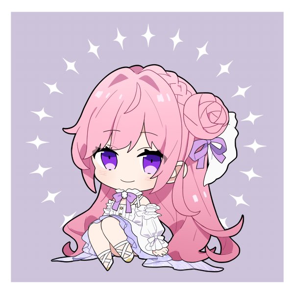 1girl bare_shoulders bow braid chibi closed_mouth detached_sleeves dorothy_(nikke) dress frilled_dress frills full_body goddess_of_victory:_nikke hair_bun hair_intakes hair_ribbon hotata_te light_blush long_hair looking_at_viewer pink_hair purple_bow purple_eyes purple_ribbon ribbon single_side_bun smile solo white_dress