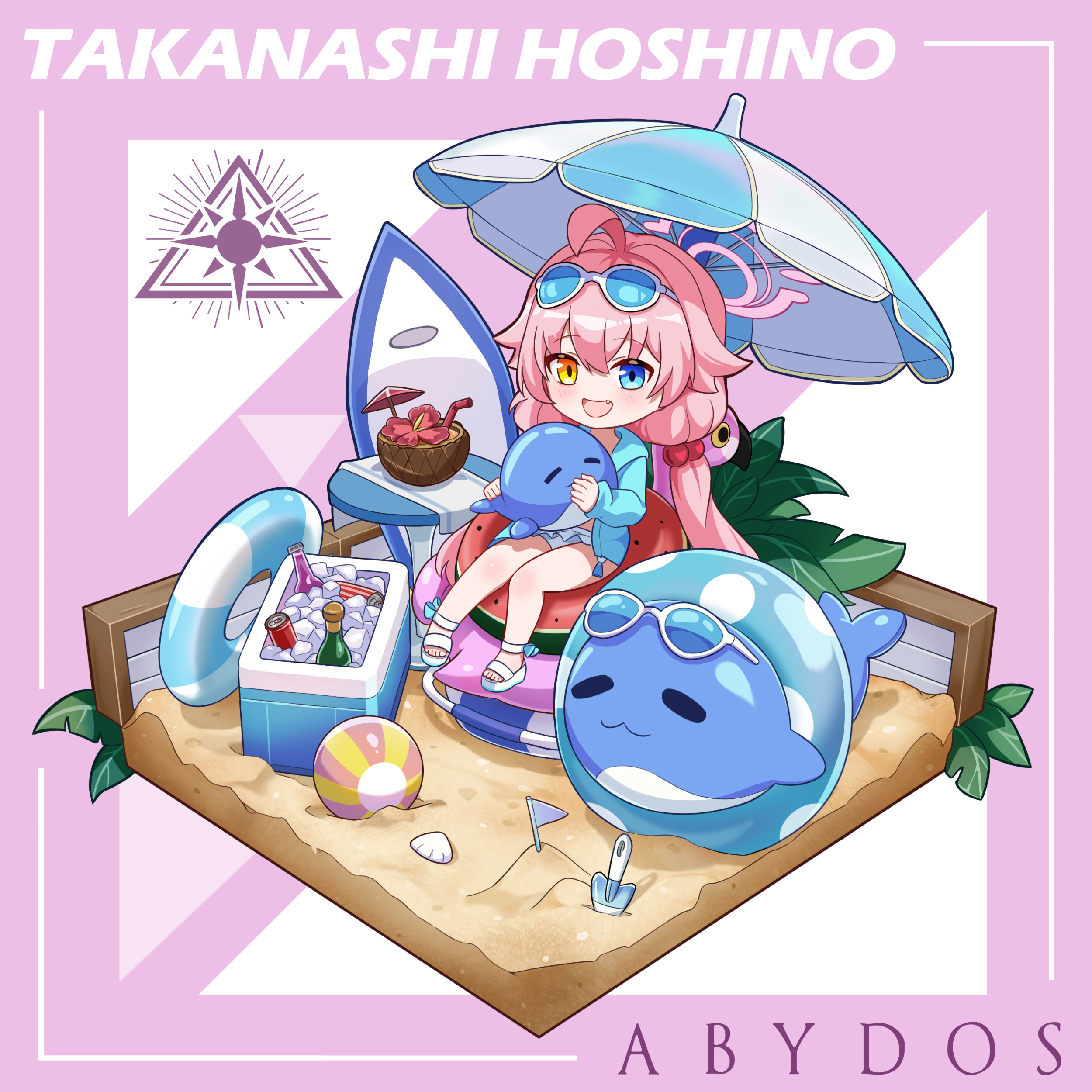 1girl :d absurdres adjusting_eyewear ahoge beach beach_chair beach_umbrella bikini blue_archive blue_jacket bottle can character_name chibi commentary_request cooler drink_can frilled_bikini frills hair_between_eyes hair_bobbles hair_ornament halo hand_scoop heterochromia highres hoshino_(blue_archive) hoshino_(swimsuit)_(blue_archive) hugging_doll hugging_object ice ice_cube jacket long_hair long_sleeves looking_at_viewer low_twintails midriff nm_hao official_alternate_costume open_clothes open_jacket open_mouth pink_hair sand_castle sand_sculpture sandals sidelocks simple_background sitting sleeveless smile soda_can solo stuffed_whale sunglasses surfboard swimsuit twintails umbrella white_bikini