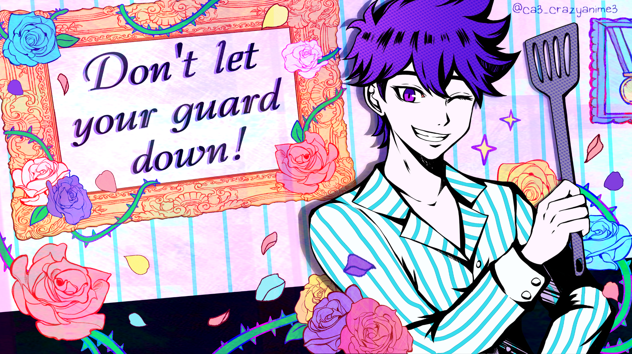 1boy collarbone colored_skin crazyanime3 english_text flower grin hero_(headspace)_(omori) hero_(omori) highres holding holding_spatula long_sleeves looking_at_viewer omori one_eye_closed pajamas persona plant purple_eyes purple_hair rose short_hair smile soejima_shigenori_(style) solo sparkle spatula striped_pajamas teeth thorns vertical-striped_clothes vertical-striped_pajamas vines white_skin