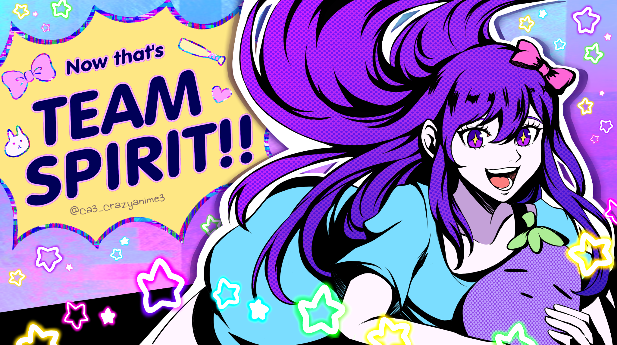 +_+ 1girl aubrey_(headspace)_(omori) aubrey_(omori) blue_shirt bow collarbone colored_skin crazyanime3 english_text hair_bow highres holding holding_stuffed_toy long_hair looking_at_viewer omori open_mouth persona pink_bow purple_eyes purple_hair shirt short_sleeves soejima_shigenori_(style) solo sparkling_eyes stuffed_eggplant stuffed_toy teeth tongue white_skin
