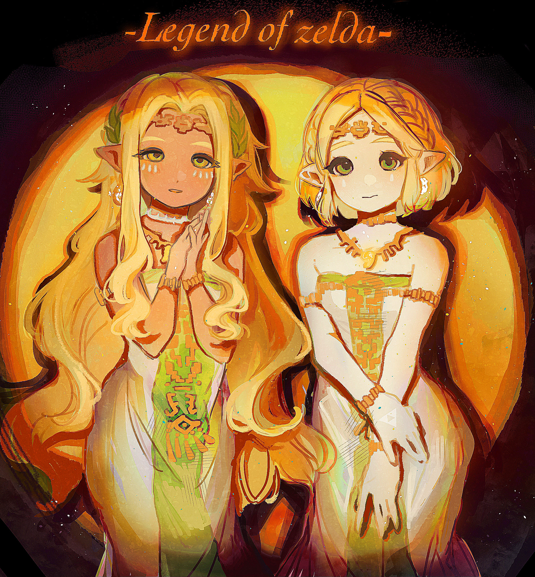 2girls armlet bare_shoulders blonde_hair bracelet braid circlet closed_mouth copyright_name dark-skinned_female dark_skin dress earrings facial_mark green_eyes hair_intakes hands_up head_wreath highres jewelry long_hair multiple_girls necklace nintendo open_mouth own_hands_together parted_bangs pointy_ears princess_zelda shanodesu short_hair smile sonia_(zelda) standing strapless strapless_dress the_legend_of_zelda the_legend_of_zelda:_tears_of_the_kingdom triforce very_long_hair wavy_hair white_dress