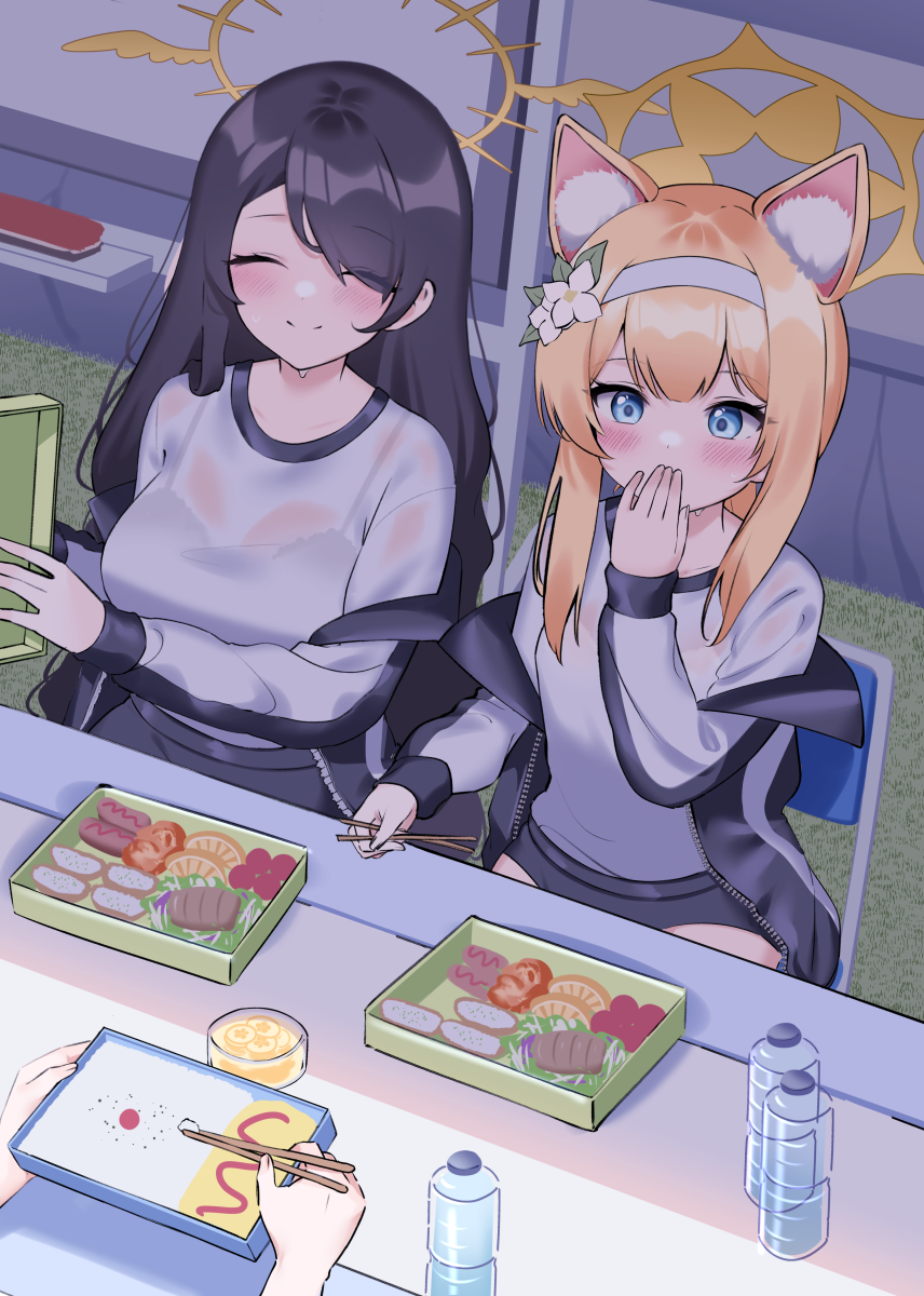 1boy 2girls ^_^ animal_ear_fluff animal_ears bento black_buruma black_hair black_jacket blue_archive blue_eyes blush bottle buruma cat_ears cat_girl chair chopsticks closed_eyes eating flower folding_chair gym_shirt gym_uniform hair_flower hair_ornament hair_over_one_eye hairband highres hinata_(blue_archive) holding holding_chopsticks ine_(ineinnen) jacket mari_(blue_archive) mari_(track)_(blue_archive) multiple_girls official_alternate_costume open_clothes open_jacket orange_hair out_of_frame plastic_bottle sensei_(blue_archive) shirt sitting table track_jacket water_bottle white_shirt