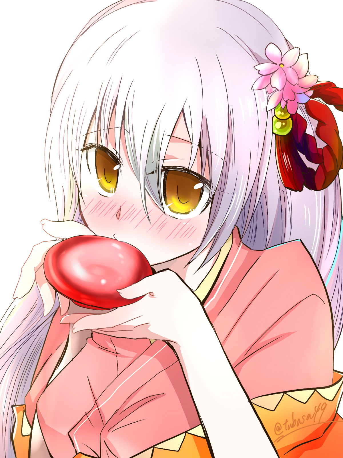 1girl alcohol artist_name blush close-up commentary_request cup drinking hair_ornament highres holding holding_cup japanese_clothes kamewaritou kimono long_bangs long_hair looking_at_viewer orange_kimono raised_eyebrows sakazuki sake sidelocks solo tenka_hyakken tubasa49 upper_body white_background white_hair yellow_eyes