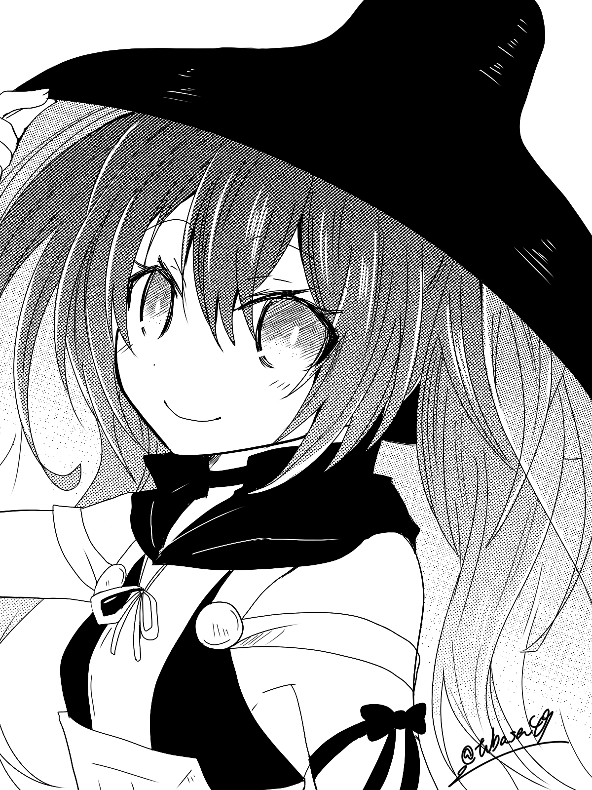 1girl adjusting_clothes adjusting_headwear arm_ribbon bare_shoulders close-up closed_mouth commentary_request eyelashes greyscale highres ichimegasa looking_at_viewer midare_mitsukane monochrome out_of_frame ribbon sidelocks signature sleeveless smile solo tenka_hyakken tubasa49