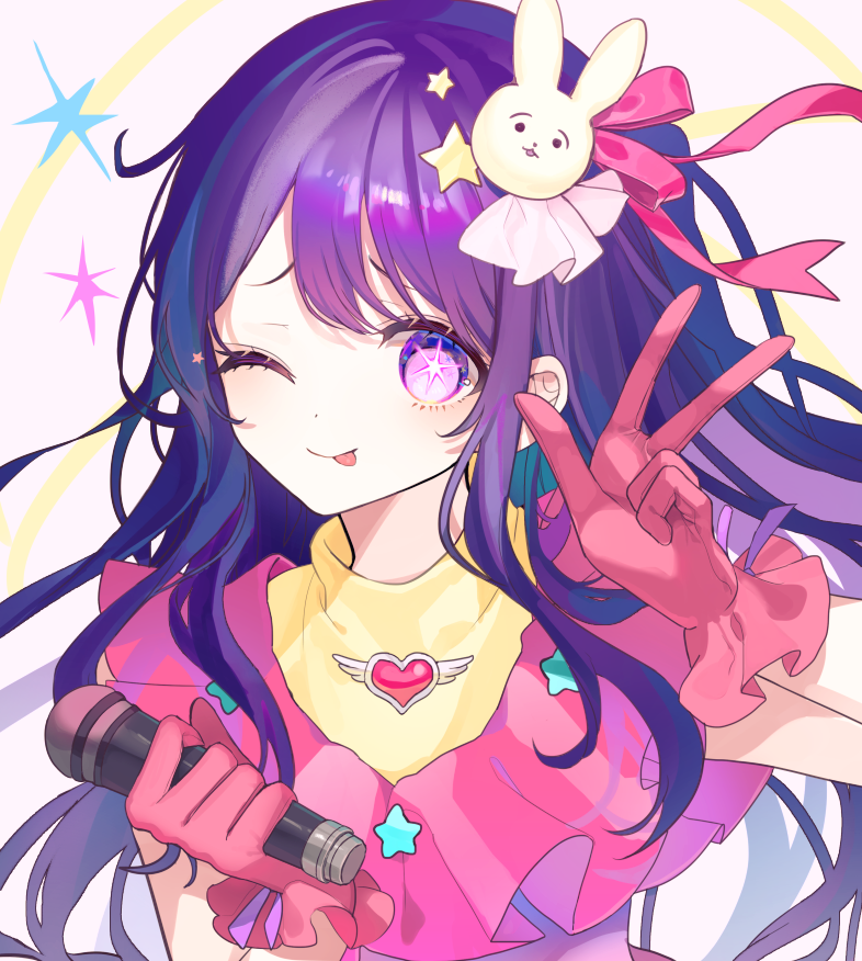 1girl closed_mouth commentary dress frilled_dress frilled_gloves frills gloves hair_ornament heart holding holding_microphone hoshino_ai idol microphone one_eye_closed one_side_up oshi_no_ko pink_dress pink_gloves pink_ribbon purple_hair rabbit_hair_ornament ribbon sidelocks solo sparkle star-shaped_pupils star_(symbol) star_hair_ornament swept_bangs symbol-shaped_pupils tongue tongue_out turtleneck turtleneck_dress v wohinya