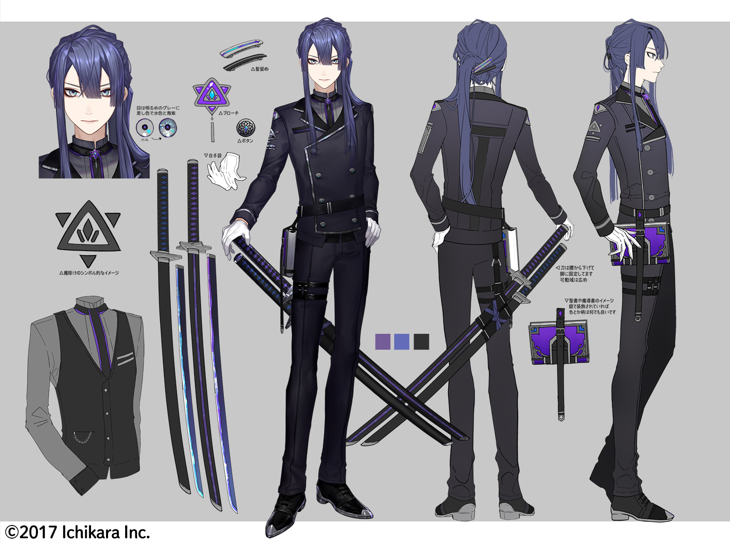 1boy belt belt_pouch black_belt black_footwear black_necktie black_pants black_vest blue_eyes blue_hair brooch buttons color_guide copyright_name double-breasted full_body gloves grey_background grey_shirt hair_ornament hairclip hand_on_hilt holding holding_sword holding_weapon jewelry katana loalo long_hair long_sleeves looking_at_viewer male_focus military military_uniform multiple_views nagao_kei nagao_kei_(1st_costume) necktie nijisanji official_art pants ponytail pouch reference_sheet second-party_source sheath shirt shoes simple_background sword thigh_strap vest virtual_youtuber weapon white_gloves