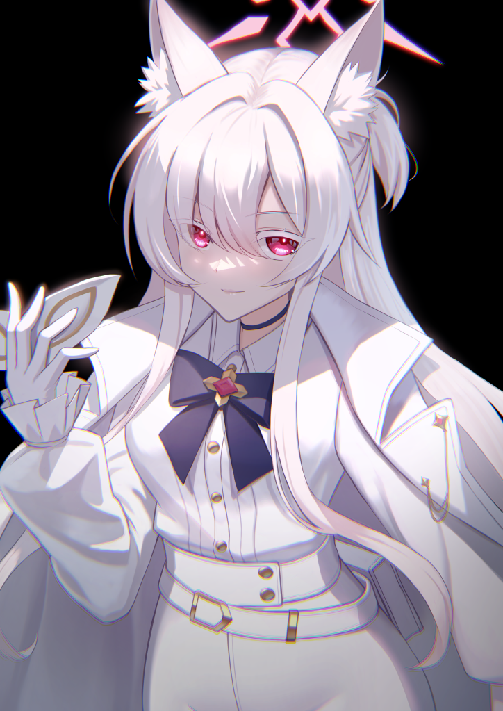 1girl akira_(blue_archive) animal_ear_fluff animal_ears answering belt black_choker blue_archive bow bowtie cape cat_ears cat_girl choker collared_cape collared_shirt eye_mask gloves halo holding holding_mask long_hair mask pants red_eyes shirt solo white_belt white_gloves white_hair white_pants white_shirt