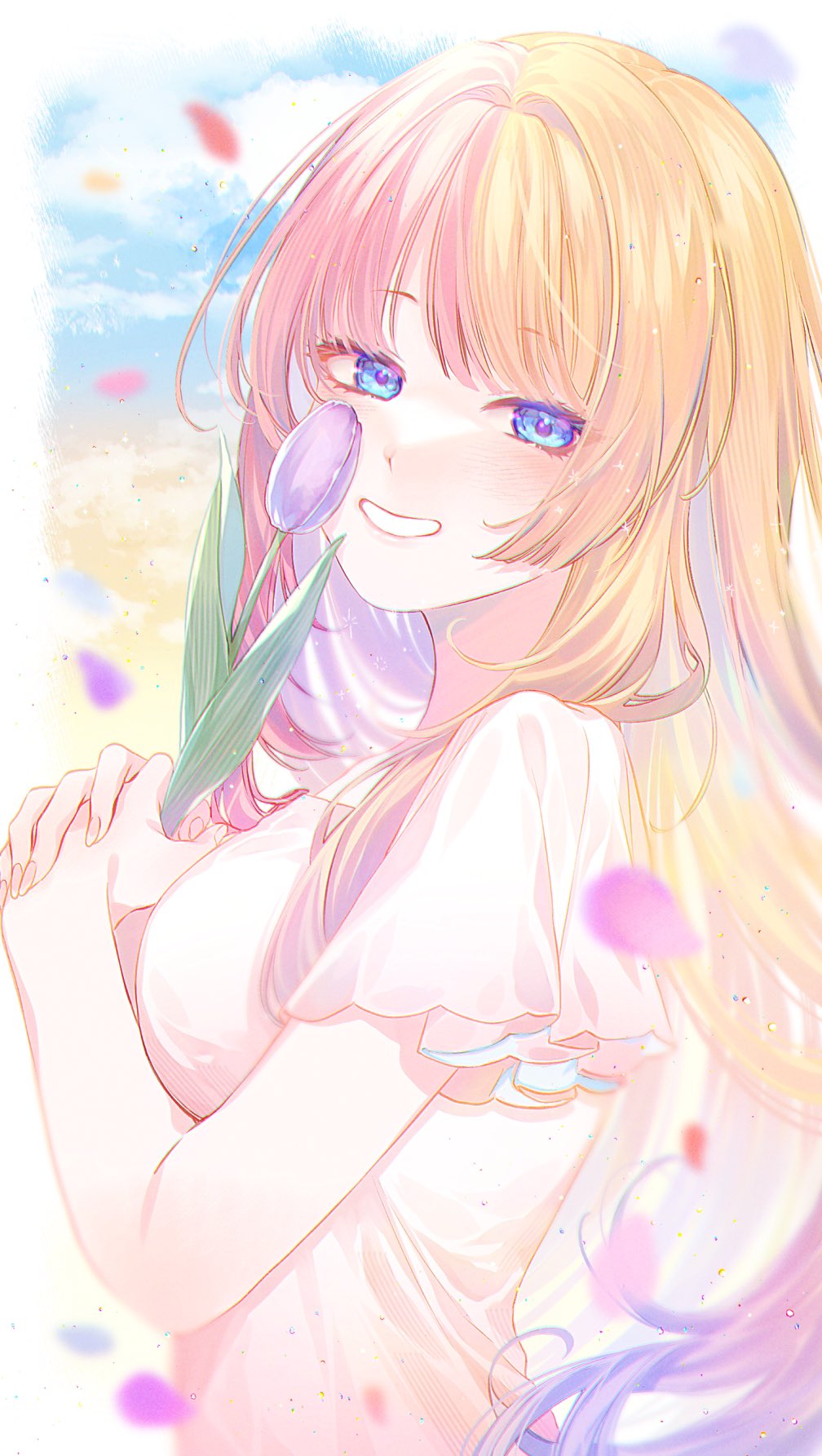 1girl blonde_hair blue_eyes commentary flower grin highres kaburagi_(pnoir087) kotoka_torahime long_hair looking_at_viewer multicolored_hair nijisanji nijisanji_en pink_hair purple_flower smile solo split-color_hair untranslatable_commentary tulip virtual_youtuber