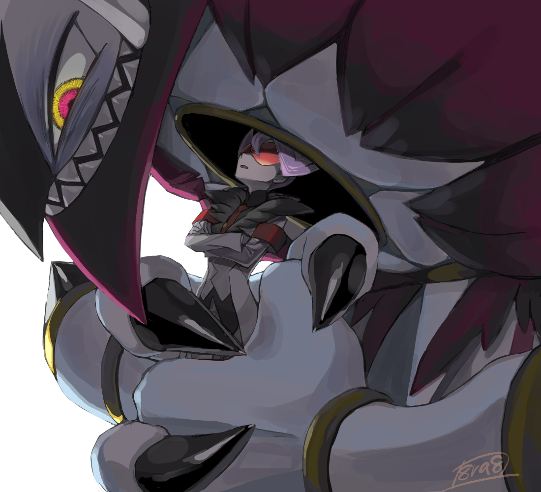 1boy claws colored_skin crossed_arms gen_6_pokemon grey_hair grey_skin haraya hoopa hoopa_(unbound) lear_(pokemon) legendary_pokemon looking_at_another male_focus multicolored_eyes mythical_pokemon nintendo parted_lips pokemon pokemon_(creature) pokemon_masters_ex red-tinted_eyewear sharp_teeth signature simple_background teeth tinted_eyewear white_background