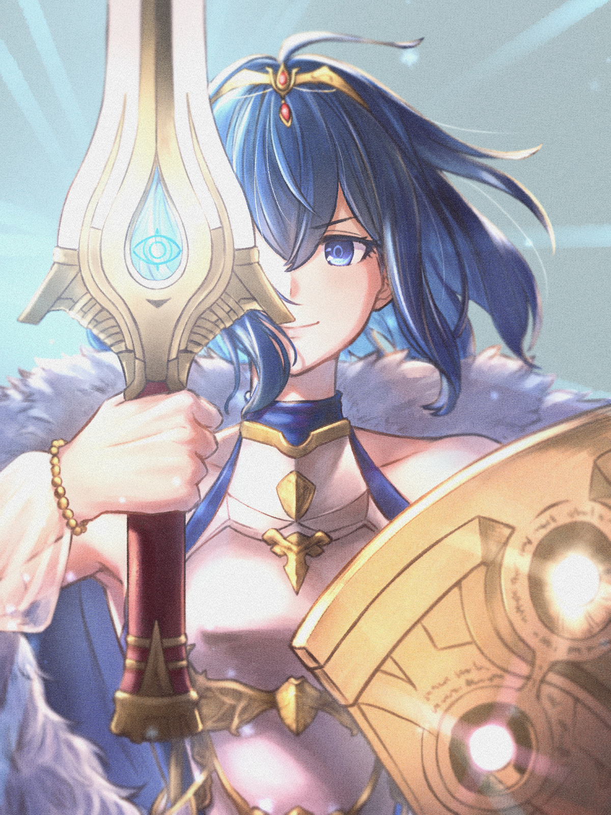 1girl armor bare_shoulders blue_eyes blue_hair fire_emblem fire_emblem_awakening highres holding holding_sword holding_weapon light lucina_(fire_emblem) lucina_(hope-ruling_queen)_(fire_emblem) nintendo sassakntm shield smile sword tiara weapon