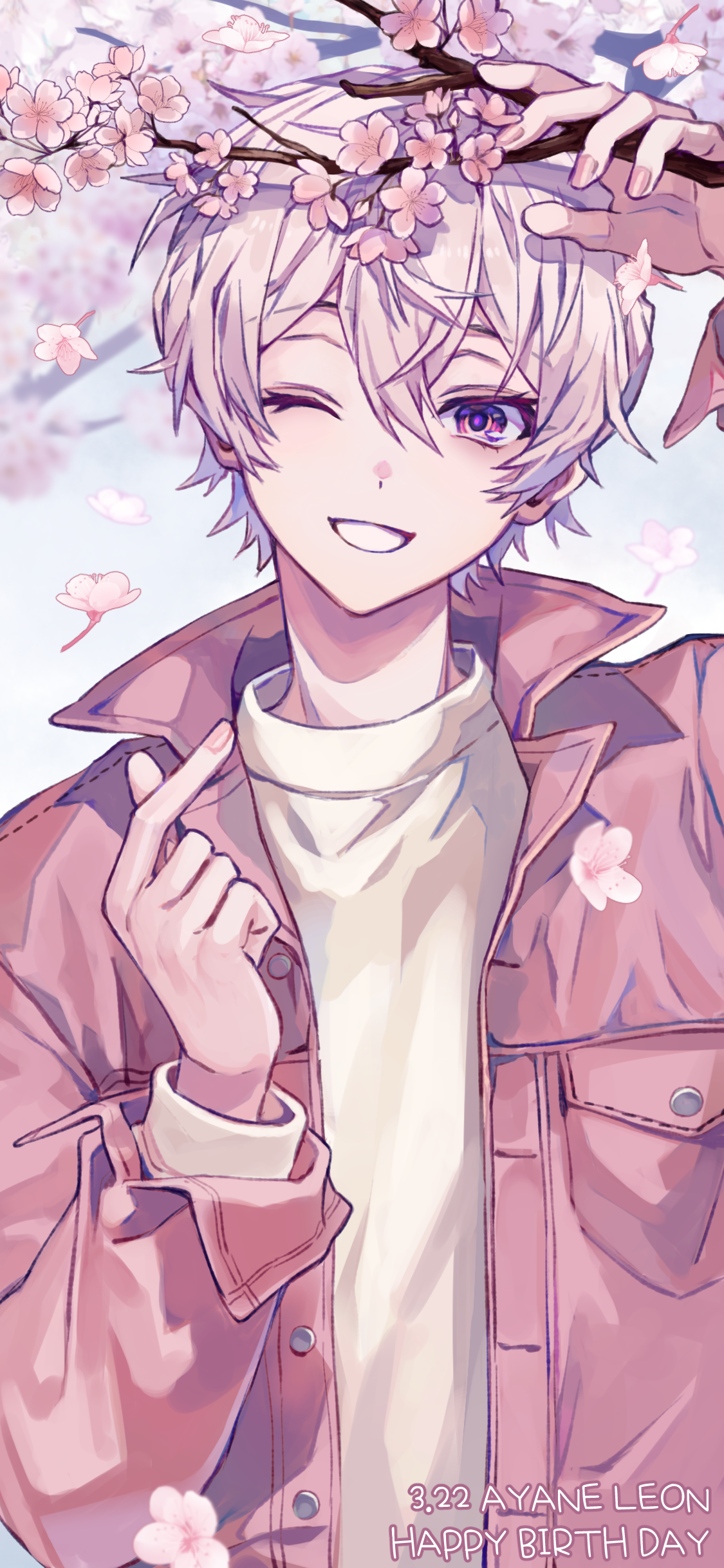 1boy ;d absurdres ayane_leon blurry blurry_background branch breast_pocket buttons character_name cherry_blossoms creepyday dated falling_flower falling_petals finger_heart flower hand_up happy_birthday head_tilt highres holding holding_branch jacket looking_at_viewer male_focus one_eye_closed open_mouth petals piece_a_part pink_flower pink_hair pink_jacket pink_nails pocket purple_eyes shirt short_hair smile solo straight-on upper_body virtual_youtuber white_shirt