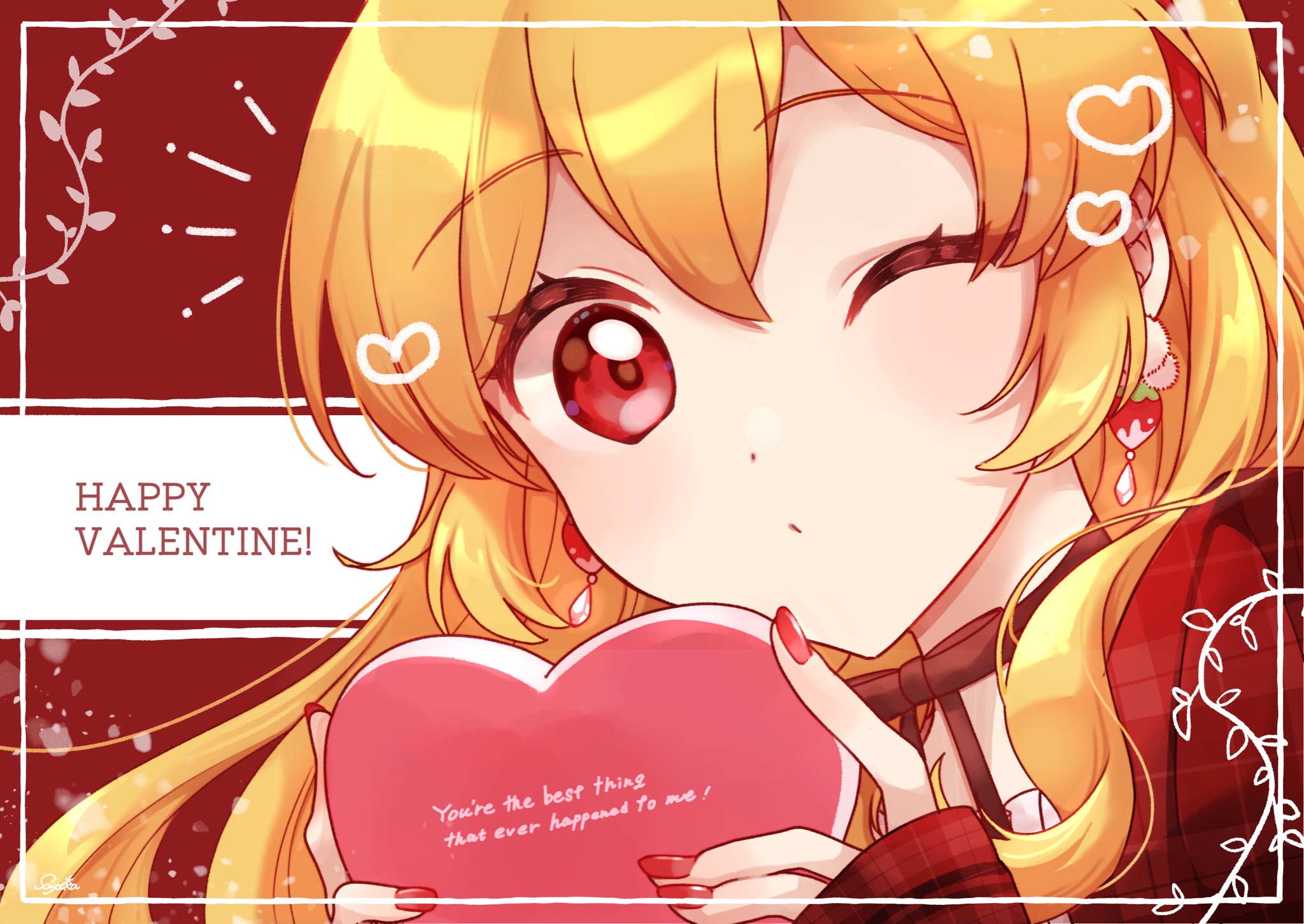 1girl aikatsu!_(series) blonde_hair blush box brown_ribbon choker closed_mouth earrings food-themed_earrings food_themed_earrings gift happy_valentine heart heart-shaped_box highres holding holding_gift hoshimiya_ichigo jewelry kaji_sayaka_(chouchou387) long_hair long_sleeves looking_at_viewer nail_polish one_eye_closed red_eyes red_nails ribbon ribbon_choker solo strawberry_earrings upper_body valentine
