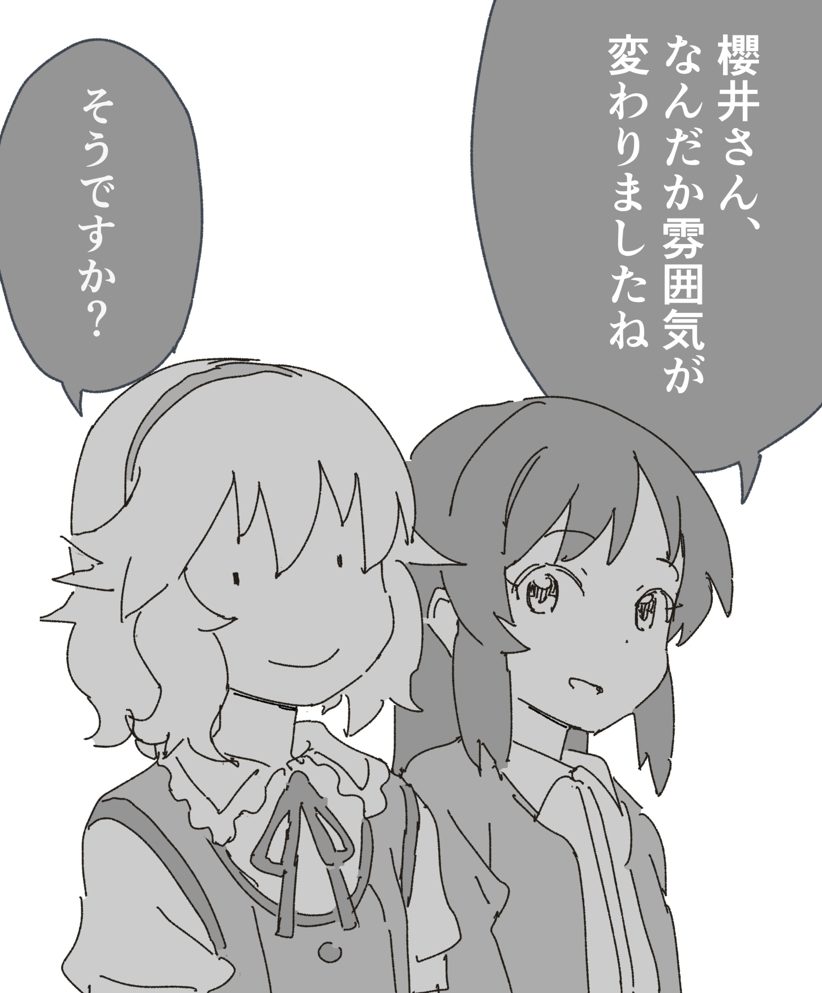 1girl 2girls greyscale hairband highres hnakn17 idolmaster idolmaster_cinderella_girls idolmaster_cinderella_girls_u149 juliet_sleeves long_hair long_sleeves mob_face monochrome multiple_girls puffy_sleeves sakurai_momoka scene_reference short_hair sidelocks simple_background smile tachibana_arisu translation_request white_background