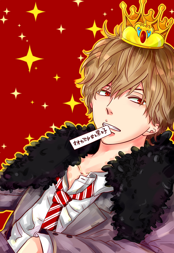1boy blazer buttoned_cuffs buttons collarbone collared_shirt commentary copyright_name crown fishchan gem grey_jacket hair_between_eyes jacket lapels light_brown_hair long_sleeves looking_away male_focus mouth_hold necktie nose notched_lapels ookami_shoujo_to_kuro_ouji open_clothes open_collar open_jacket open_mouth outline red_background red_eyes red_gem red_necktie sata_kyouya school_uniform shirt short_hair solo sparkle_background striped_clothes striped_necktie untranslatable_commentary teeth teeth_hold translated two-tone_necktie unbuttoned upper_body white_necktie yellow_outline
