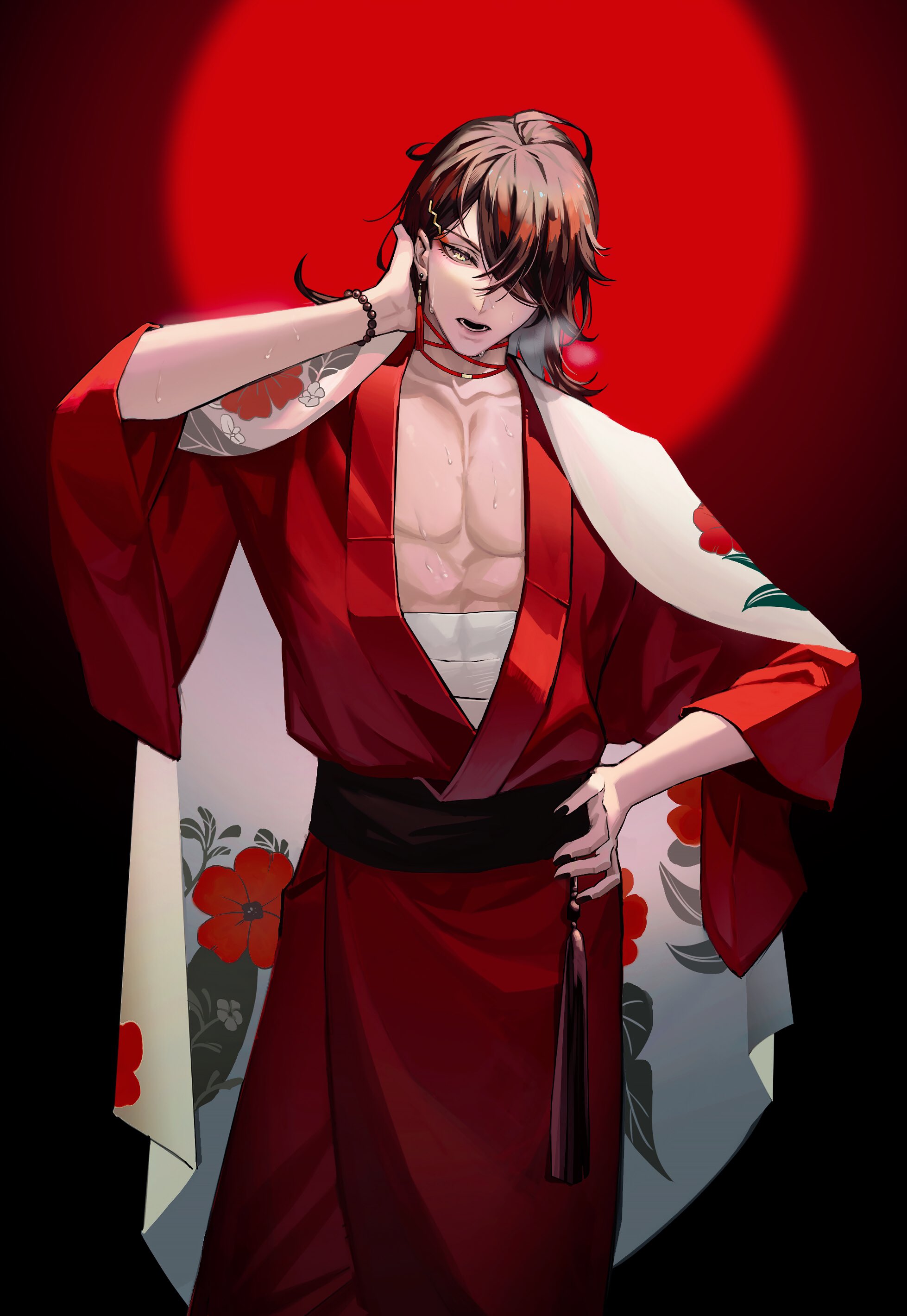 1boy absurdres ahoge arm_up bandages bead_bracelet beads black_hair black_nails black_sash bracelet breath choker collarbone commentary crossed_bangs earrings english_commentary eyeshadow fingernails floral_print gradient_background hair_ornament hair_over_one_eye hairclip hand_on_own_hip highres japanese_clothes jewelry kimono long_hair long_sleeves looking_at_viewer lower_teeth_only makeup male_focus midriff_sarashi multicolored_hair nail_polish nijisanji nijisanji_en obi one_eye_covered open_clothes open_kimono open_mouth parted_bangs pectorals red_background red_choker red_eyeshadow red_hair red_kimono rin_(chenirin2) round_teeth sarashi sash sidelocks simple_background single_earring solo standing swept_bangs tassel tassel_earrings teeth virtual_youtuber vox_akuma wet wide_sleeves yellow_eyes