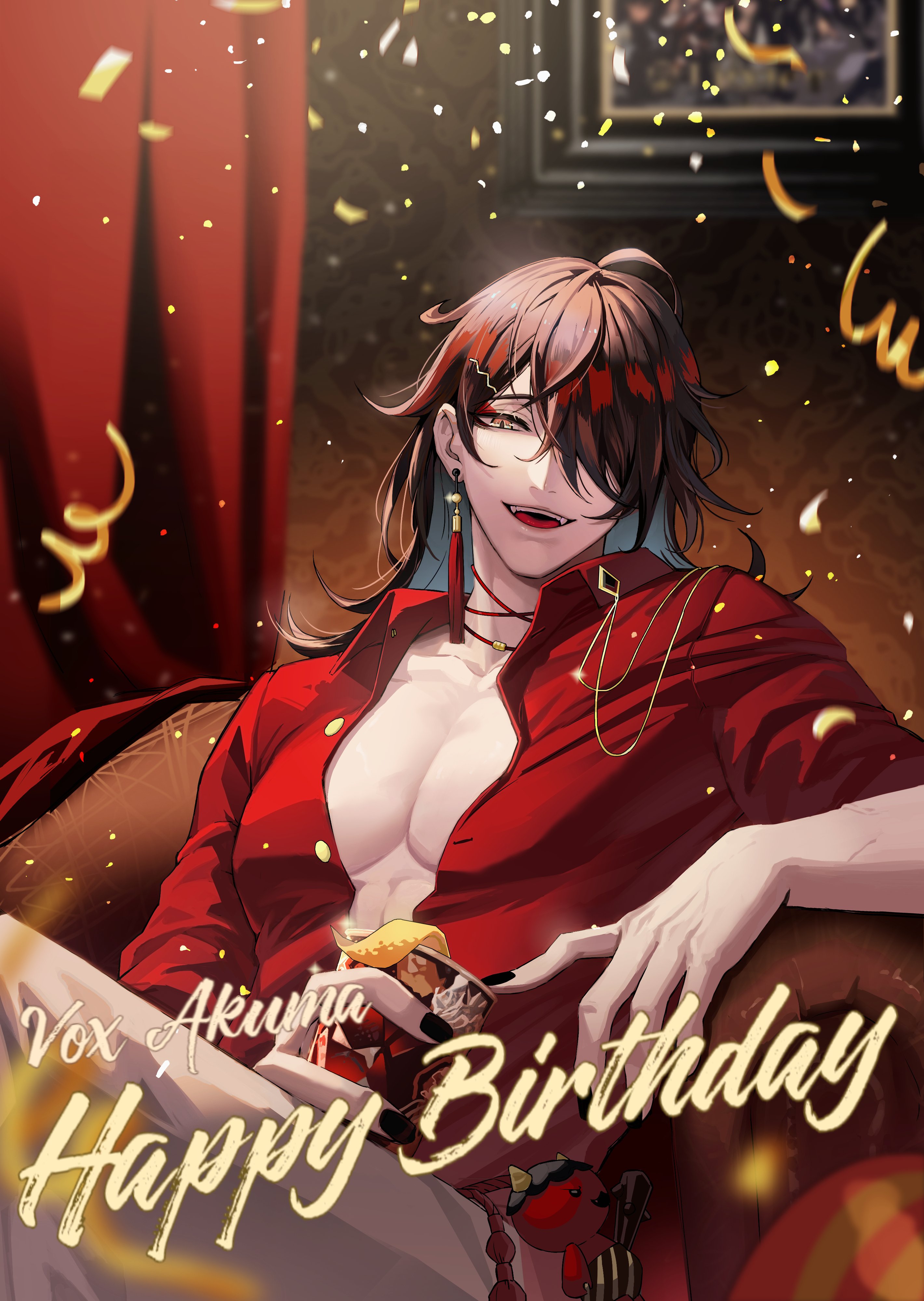 1boy absurdres ahoge black_hair black_nails blurry blurry_background blurry_foreground buttons character_name choker collarbone collared_shirt commentary confetti couch crossed_bangs crossed_legs curtains dress_shirt earrings english_commentary eyeshadow fangs fingernails hair_ornament hair_over_one_eye hairclip happy_birthday highres holding indoors jewelry light_particles long_hair long_sleeves looking_at_viewer makeup male_focus multicolored_hair nail_polish nijisanji nijisanji_en one_eye_covered oni_giri_(vox_akuma) open_clothes open_mouth open_shirt pants parted_bangs pectorals picture_frame red_choker red_eyeshadow red_hair red_shirt rin_(chenirin2) shirt sidelocks single_earring sitting smile solo swept_bangs tassel tassel_earrings teeth tongue upper_teeth_only virtual_youtuber vox_akuma white_pants wing_collar yellow_eyes