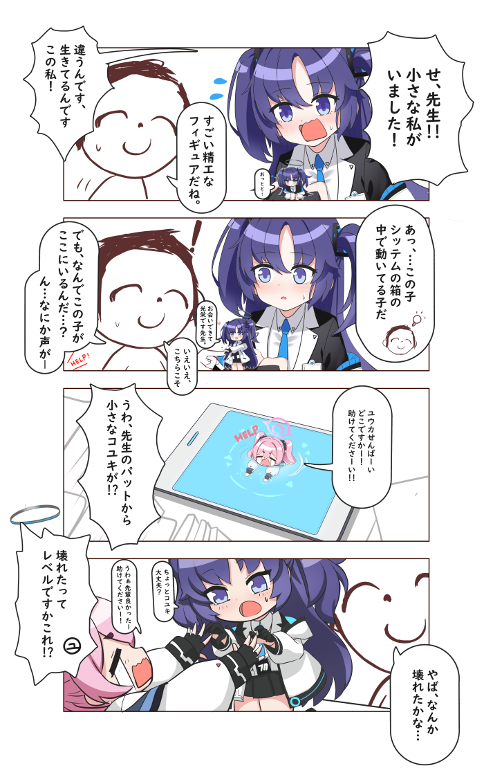 1boy 3girls 4koma black_gloves black_skirt blazer blue_archive blue_necktie clone coat collared_shirt comic commentary_request crying doodle_sensei_(blue_archive) fingerless_gloves flying_sweatdrops gloves hair_between_eyes hair_ornament halo id_card jacket koyuki_(blue_archive) long_hair long_sleeves looking_at_another mini_person minigirl multiple_girls necktie open_clothes open_coat parted_bangs pink_hair pleated_skirt purple_eyes purple_hair school_uniform sensei_(blue_archive) shirt shooka sidelocks skirt streaming_tears sweatdrop tablet_pc tears translation_request triangle_hair_ornament twintails two_side_up white_coat yuuka_(blue_archive)