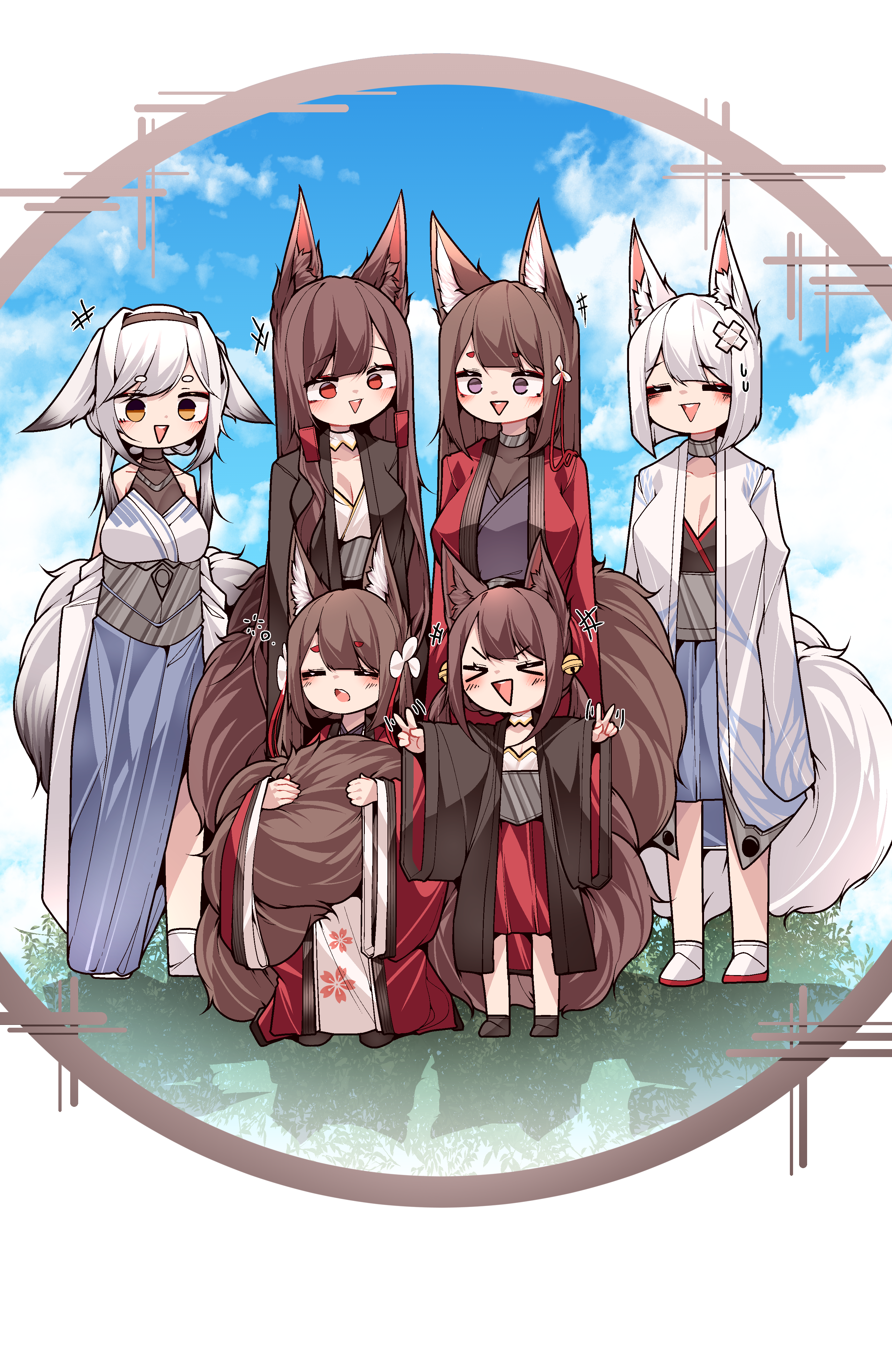 >_< 6+girls :d =_= absurdres akagi-chan_(azur_lane) akagi_(azur_lane) amagi-chan_(azur_lane) amagi_(azur_lane) animal_ears azur_lane bare_legs bare_shoulders bell black_kimono blue_skirt blush breasts brown_hair cleavage double_v ears_down eyeshadow floral_print flower fox_ears fox_girl fox_tail full_body gradient_hair hair_bell hair_between_eyes hair_flower hair_ornament happy highres holding_own_tail japanese_clothes kaga_(azur_lane) kimono kitsune large_breasts long_hair long_sleeves looking_at_viewer makeup medium_breasts medium_hair mother_and_child mother_and_daughter multicolored_hair multiple_girls multiple_tails no_mask open_mouth orange_eyes parent_and_child print_kimono purple_eyes red_eyes red_eyeshadow red_kimono red_skirt samip short_hair skirt small_breasts smile standing tail teeth tosa_(azur_lane) upper_teeth_only v very_long_hair white_hair white_kimono wide_sleeves yellow_eyes