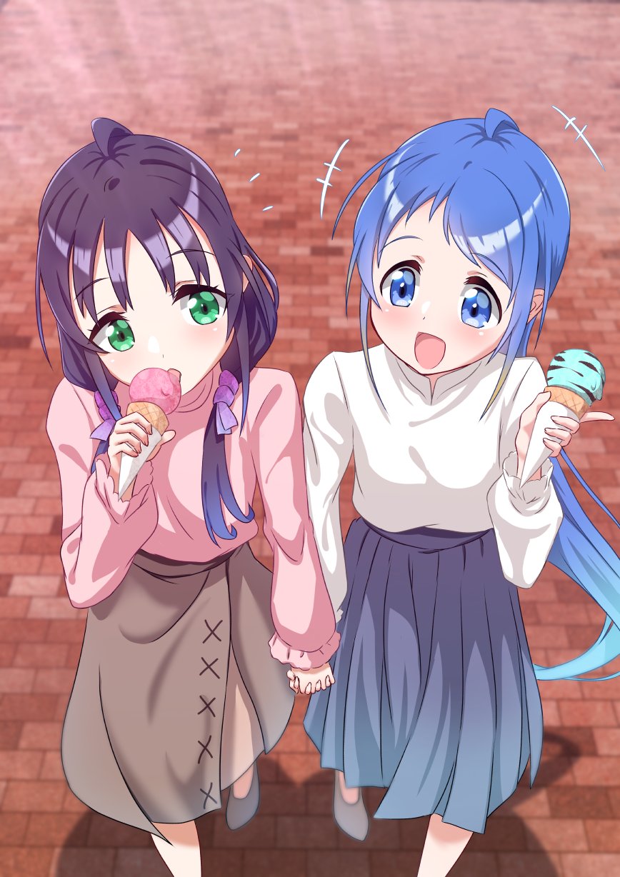 2girls ahoge black_hair blue_eyes blue_hair brick_road brown_skirt feet_out_of_frame food gradient_hair green_eyes grey_skirt highres ice_cream kantai_collection long_hair low_twintails multicolored_hair multiple_girls official_alternate_costume pink_sweater pleated_skirt samidare_(kancolle) shirt skirt suzukaze_(kancolle) sweater swept_bangs twintails very_long_hair white_shirt yokoshima_(euphoria)