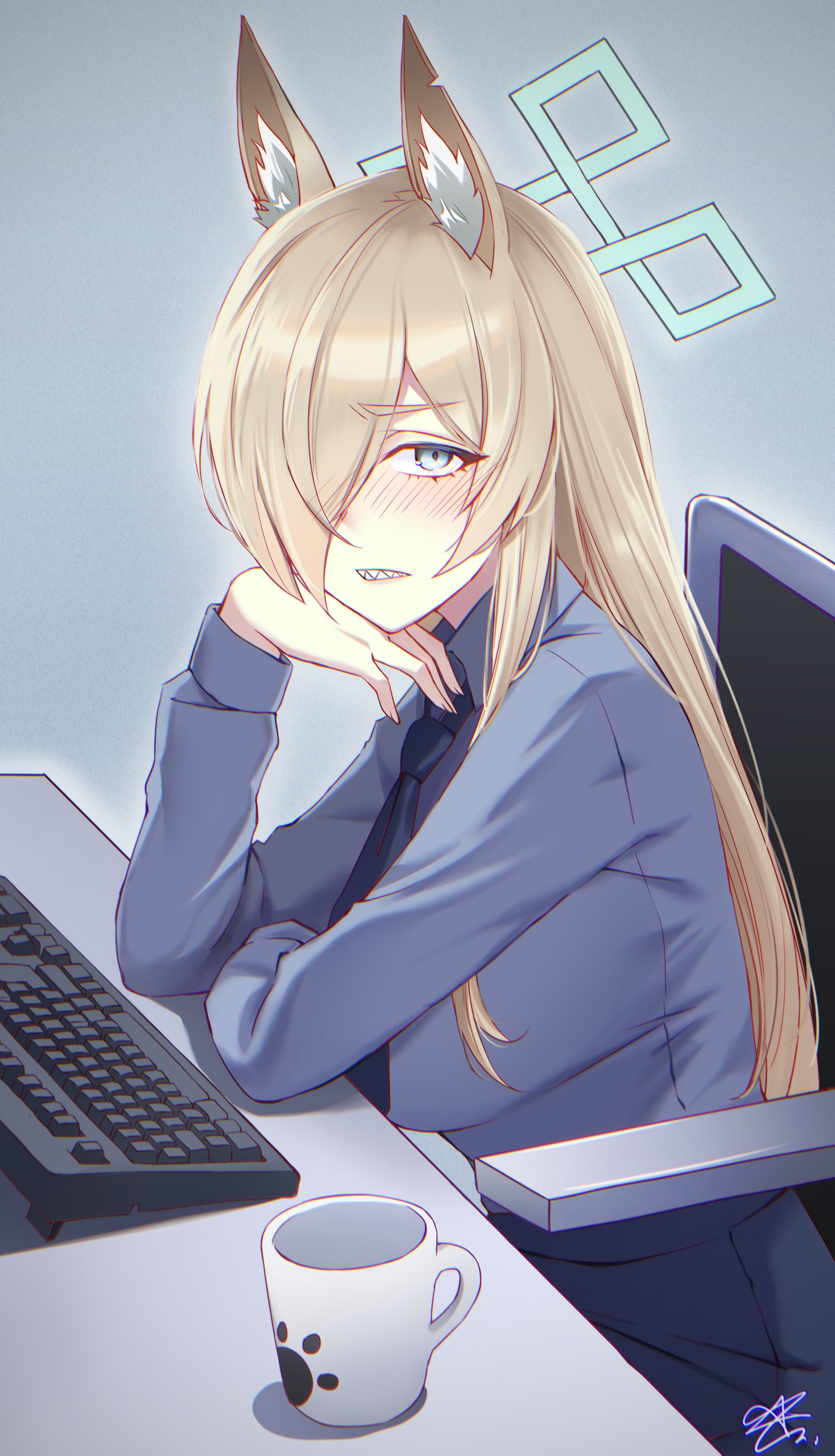 1girl absurdres akira_(if_eyeeye) animal_ear_fluff animal_ears arm_support armchair black_necktie blue_archive blue_eyes blush chair commentary_request computer computer_keyboard cup desk dog_ears dog_girl hair_over_one_eye halo highres kanna_(blue_archive) leaning_forward light_brown_hair long_hair long_sleeves looking_at_viewer mug necktie office_chair paw_print police police_uniform policewoman sharp_teeth sidelocks simple_background sitting solo swivel_chair teeth