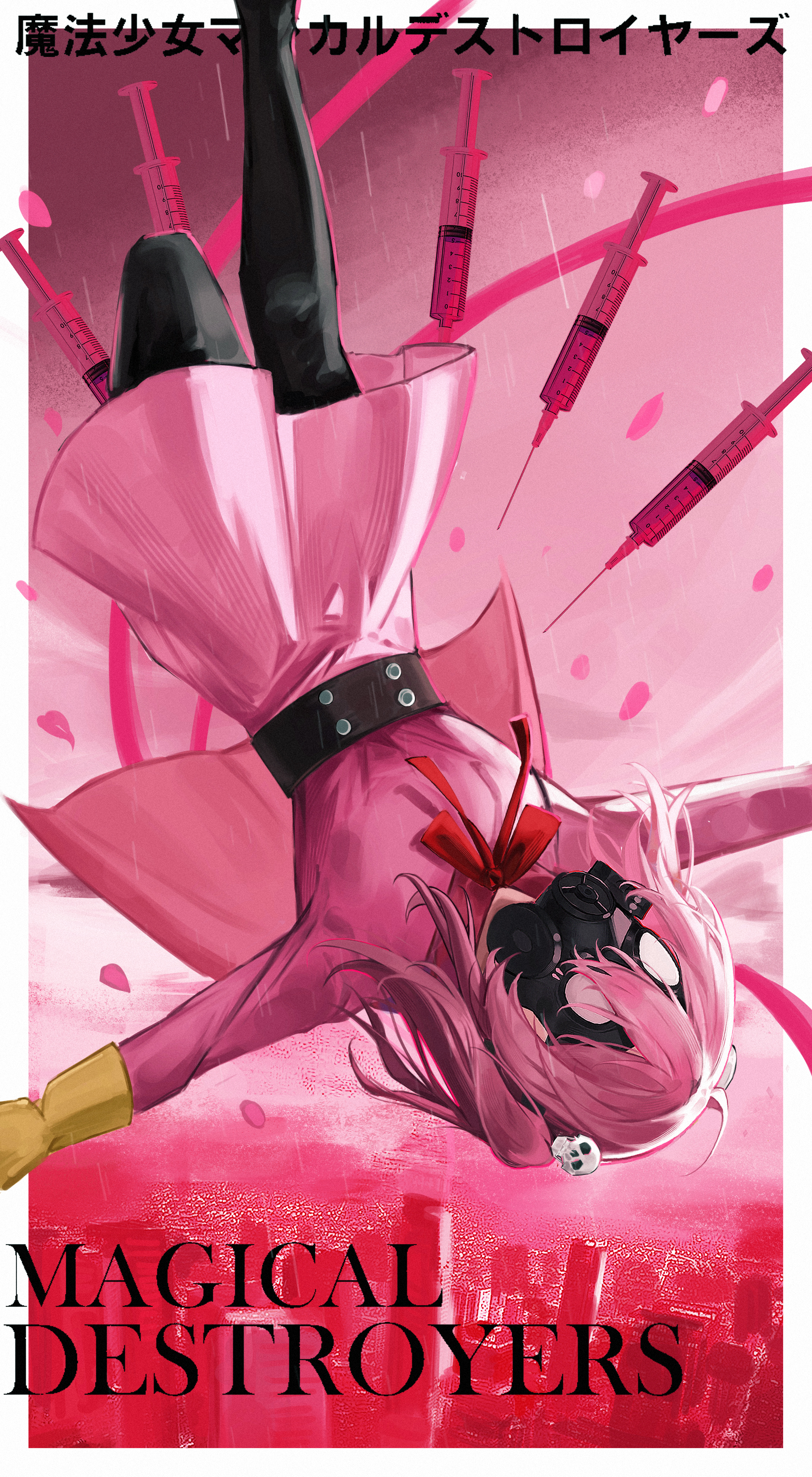 1girl absurdres ahoge belt black_pantyhose border commentary copyright_name dress english_commentary feet_out_of_frame gas_mask gloves hair_between_eyes hair_ornament haizou_bingsan highres mahou_shoujo_magical_destroyers mask medium_hair outstretched_arms pantyhose pink_(magical_destroyers) pink_dress pink_hair pink_theme red_ribbon ribbon skull_hair_ornament skyline solo spread_arms syringe twintails upside-down white_border yellow_gloves