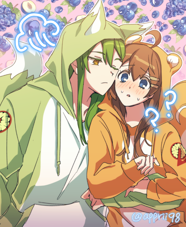 1boy 1girl ahoge animal_hood bbunny blue_eyes blush brown_hair drawstring fox_hood fox_tail green_hair green_hoodie hair_ornament hairclip hetero hod_(project_moon) hood hood_up hoodie hug lobotomy_corporation logo long_hair long_sleeves looking_at_another netzach_(project_moon) one_eye_closed open_mouth orange_hoodie project_moon squirrel_hood squirrel_tail sweat tail very_long_hair yellow_eyes