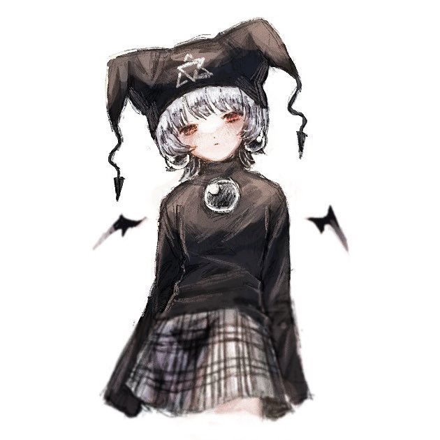 1girl bat_wings black_hat closed_mouth cowboy_shot earrings expressionless hat hexagram jester_cap jewelry long_sleeves looking_at_viewer mayura plaid_clothes plaid_skirt red_eyes short_hair simple_background skirt sleeves_past_wrists solo standing ukagaka w0_0ny_chloe white_background white_hair wings
