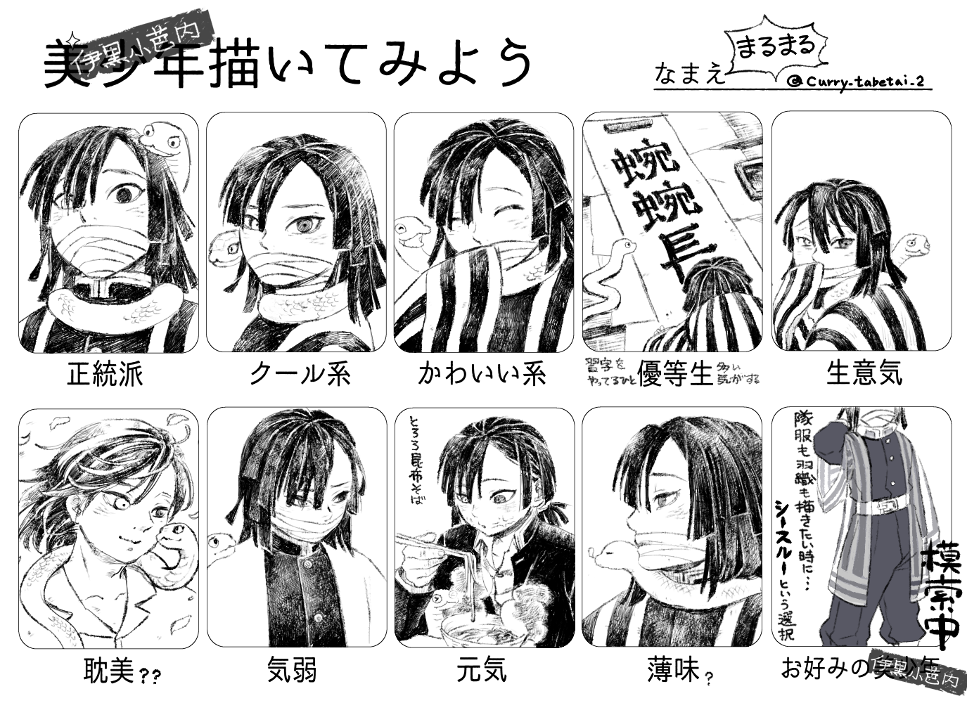 1boy animal animal_around_neck bandaged_head bandages blowing blowing_on_food bowl calligraphy chart chopsticks closed_eyes covered_mouth demon_slayer_uniform eating eye_contact facing_viewer floating_hair food hair_over_one_eye hand_to_own_mouth hand_up haori happy head_out_of_frame heterochromia holding holding_chopsticks hospital_gown iguro_obanai jacket japanese_clothes kaburamaru kimetsu_no_yaiba long_sleeves looking_at_animal looking_at_another looking_at_viewer looking_away looking_back male_focus marumaru_(curry_tabetai_2) meme_request noodles nose_bubble pants petals portrait profile short_hair sleeping sleeves_past_fingers sleeves_past_wrists smile snake standing steam striped_clothes striped_jacket translation_request wind