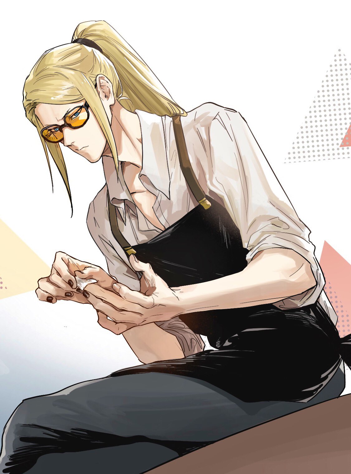 1boy apron black_apron black_nails black_pants blonde_hair blue_eyes crossed_legs fate/grand_order fate_(series) highres long_hair looking_at_viewer male_focus orange-tinted_eyewear pants ponytail shirt sitting sleeves_rolled_up solo sunglasses tezcatlipoca_(fate) tinted_eyewear washblackmud white_background white_shirt