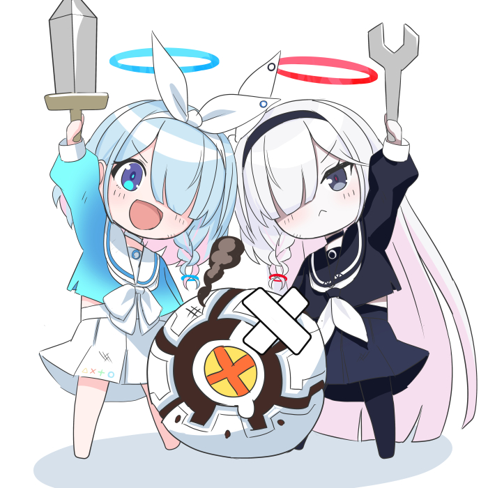 2girls :< :d arm_up arona_(blue_archive) black_choker black_coat black_eyes black_pantyhose black_serafuku black_skirt blue_archive blue_eyes blue_serafuku braid chesed_(blue_archive) choker coat colored_eyelashes colored_inner_hair commentary_request full_body hair_ornament hair_over_one_eye hairband halo holding holding_sword holding_weapon holding_wrench long_hair long_sleeves looking_at_viewer midriff multicolored_hair multiple_girls open_clothes open_coat open_mouth pantyhose plana_(blue_archive) pleated_skirt school_uniform serafuku shooka short_hair sidelocks simple_background single_braid skirt smile standing sword two-tone_hair v-shaped_eyebrows weapon white_choker white_hair white_skirt wrench