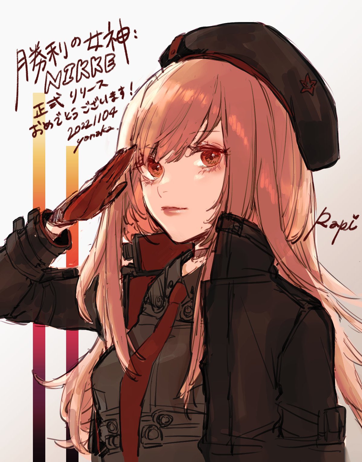 1girl beret black_gloves black_hat black_jacket black_shirt breasts character_name closed_mouth collared_shirt cropped_jacket dated eyelashes gloves goddess_of_victory:_nikke hat highres jacket light_brown_hair lips long_hair long_sleeves looking_at_viewer medium_breasts necktie orange_eyes rapi_(nikke) red_gloves red_jacket red_necktie salute shirt smile solo two-sided_fabric two-sided_jacket two-tone_gloves upper_body yonaka_(my0nk)