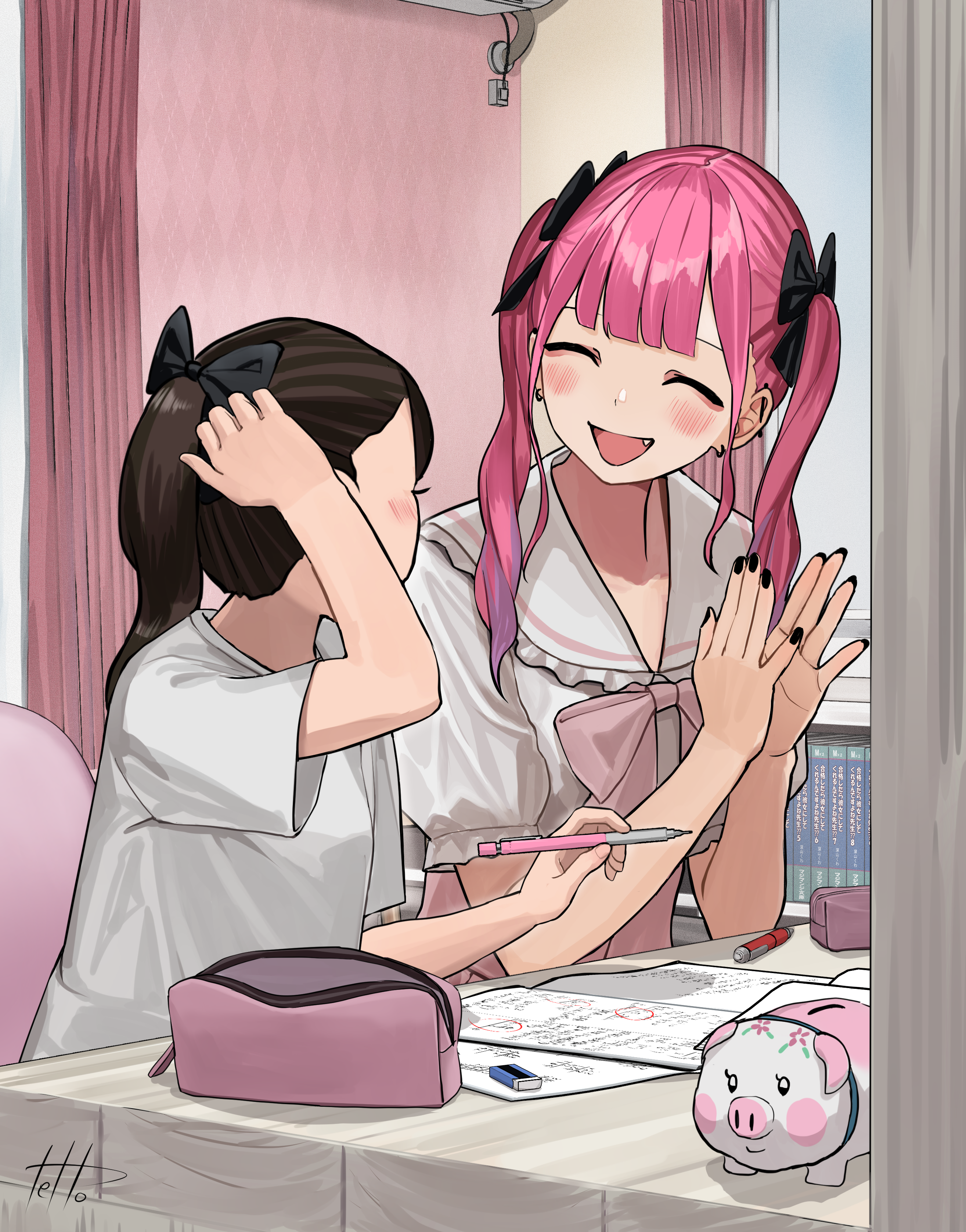 2girls :d absurdres black_bow black_nails blush bow brown_hair closed_eyes day eraser fang fingernails frilled_shirt frills hair_bow helping highres hinamizawa_hinami_(tetto) homework indoors jirai_kei mechanical_pencil multiple_girls open_mouth original paper pencil piggy_bank pink_hair shirt short_sleeves slice_of_life smile t-shirt tetto_(onnoveltet) twintails white_shirt