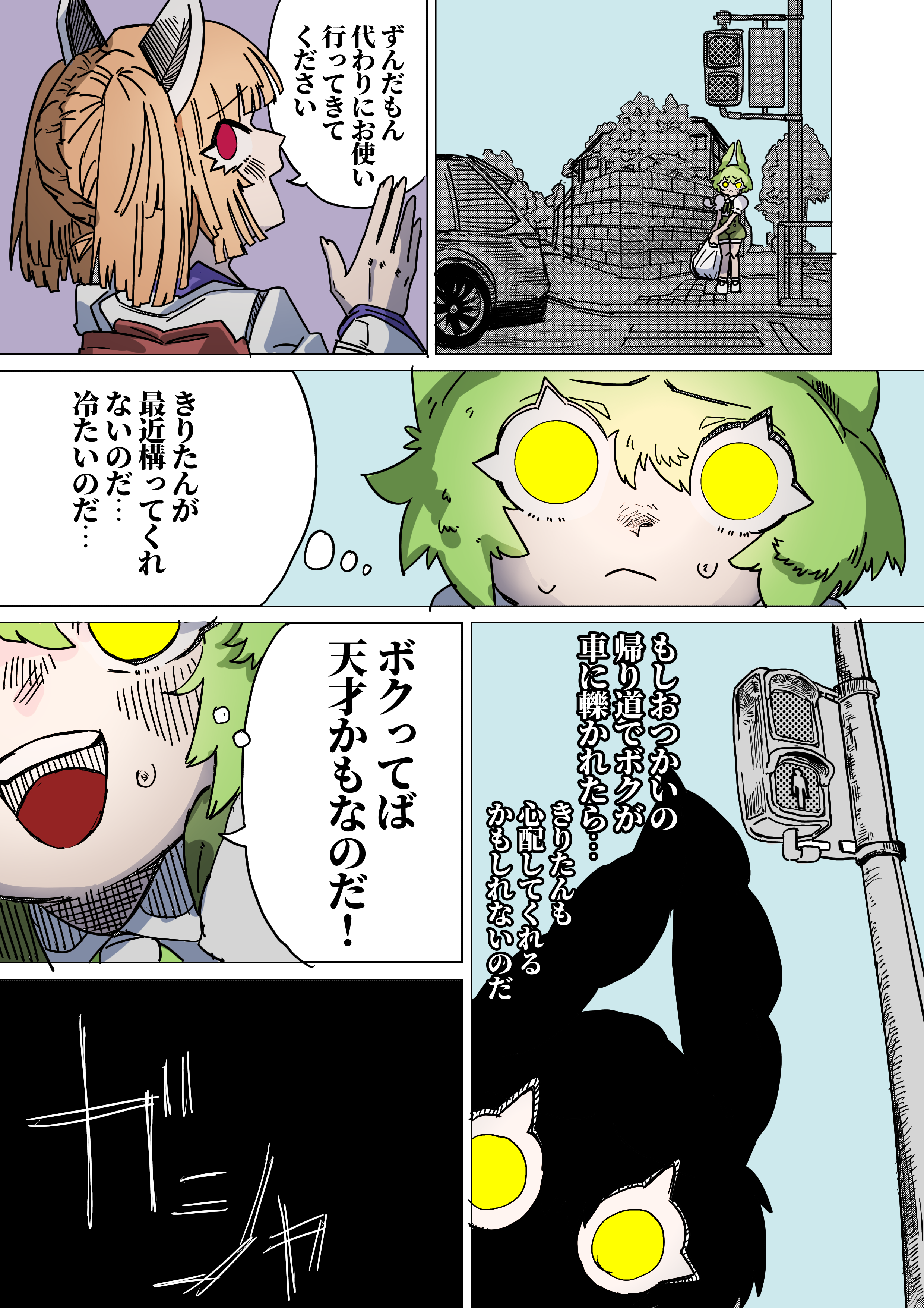 2girls absurdres bag blade blunt_bangs blush car car_crash check_commentary close-up closed_mouth comic commentary_request day eyelashes flat_color frown furrowed_brow green_hair green_shorts hand_up headgear highres holding holding_bag japanese_clothes kimono light_brown_hair motor_vehicle multiple_girls no_pupils outdoors partially_colored pedestrian_lights plastic_bag puchu puffy_short_sleeves puffy_shorts puffy_sleeves red_eyes shirt short_hair short_sleeves shorts silhouette smile standing suspender_shorts suspenders sweat touhoku_kiritan town translated twintails utility_pole voiceroid voicevox white_kimono white_shirt worried yellow_eyes zundamon