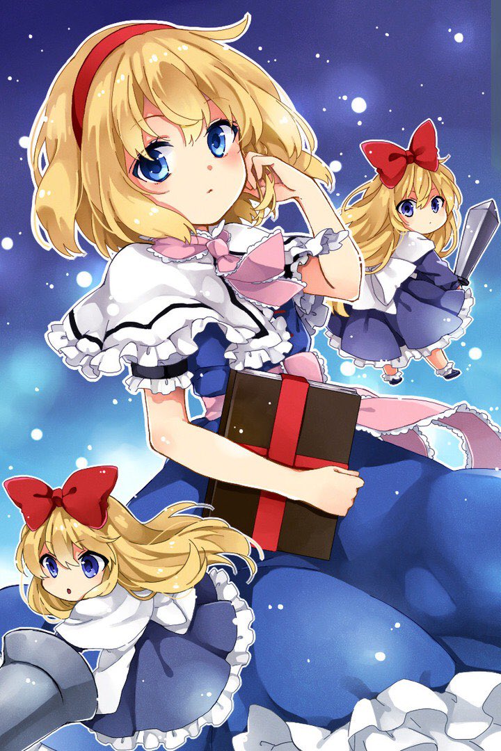 3girls alice_margatroid blonde_hair blue_background blue_dress blue_eyes blush book dress hairband holding holding_book holding_polearm holding_sword holding_weapon long_hair looking_at_viewer multiple_girls polearm red_hairband red_ribbon ribbon shanghai_doll short_hair spear sugu016406 sword touhou weapon